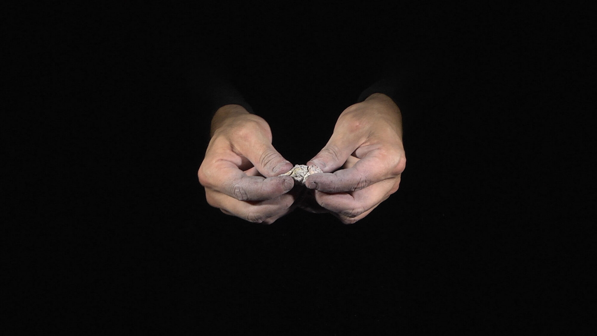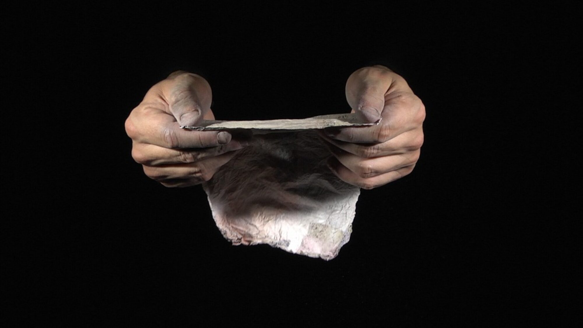 Une page de magazine est froissée et défroissée, dans un geste répété: l’image disparaît à vue d’œil tandis que l’encre de la page s’imprime sur les mains qui, alternativement, dérobent et révèlent au regard l’image évanescente. Ce transfert dissout les visages et les corps idéalisés de ces images publicitaires, les réduit en poussière, les imprime sur les doigts, tandis que la feuille de papier devient elle-même une peau, un tissu organique.