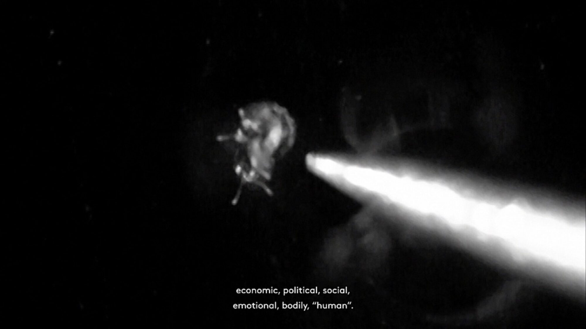Les biologistes considèrent la méduse Turritopsis dohrnii comme pratiquement immortelle. Elle peut en effet régénérer son ADN jusqu’à 14 fois et est ainsi techniquement en mesure de renaître. Le travail vidéo « Perpetual Operator » de Dominique Koch associe la destinée de cette espèce de méduse et les déclarations du sociologue Maurizio Lazzarato et de Franco ‘Bifo’ Berardi. La méduse fonctionne comme personnage d’un cycle complexe qui commente l’état d’un modèle capitaliste au bord de l’effondrement, et compare ce dernier avec les parangons de l’art contemporain. (Nadine Wietlisbach)
