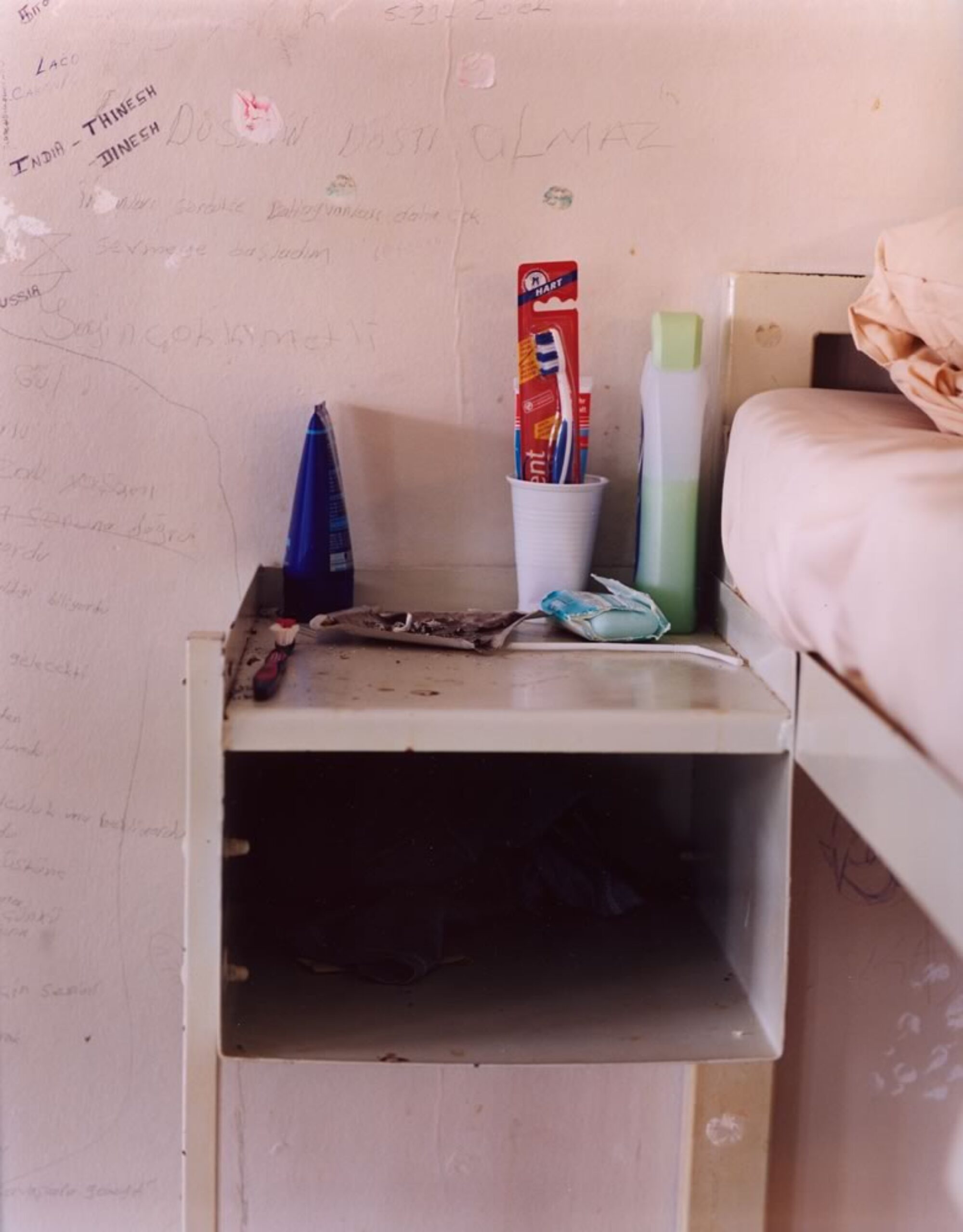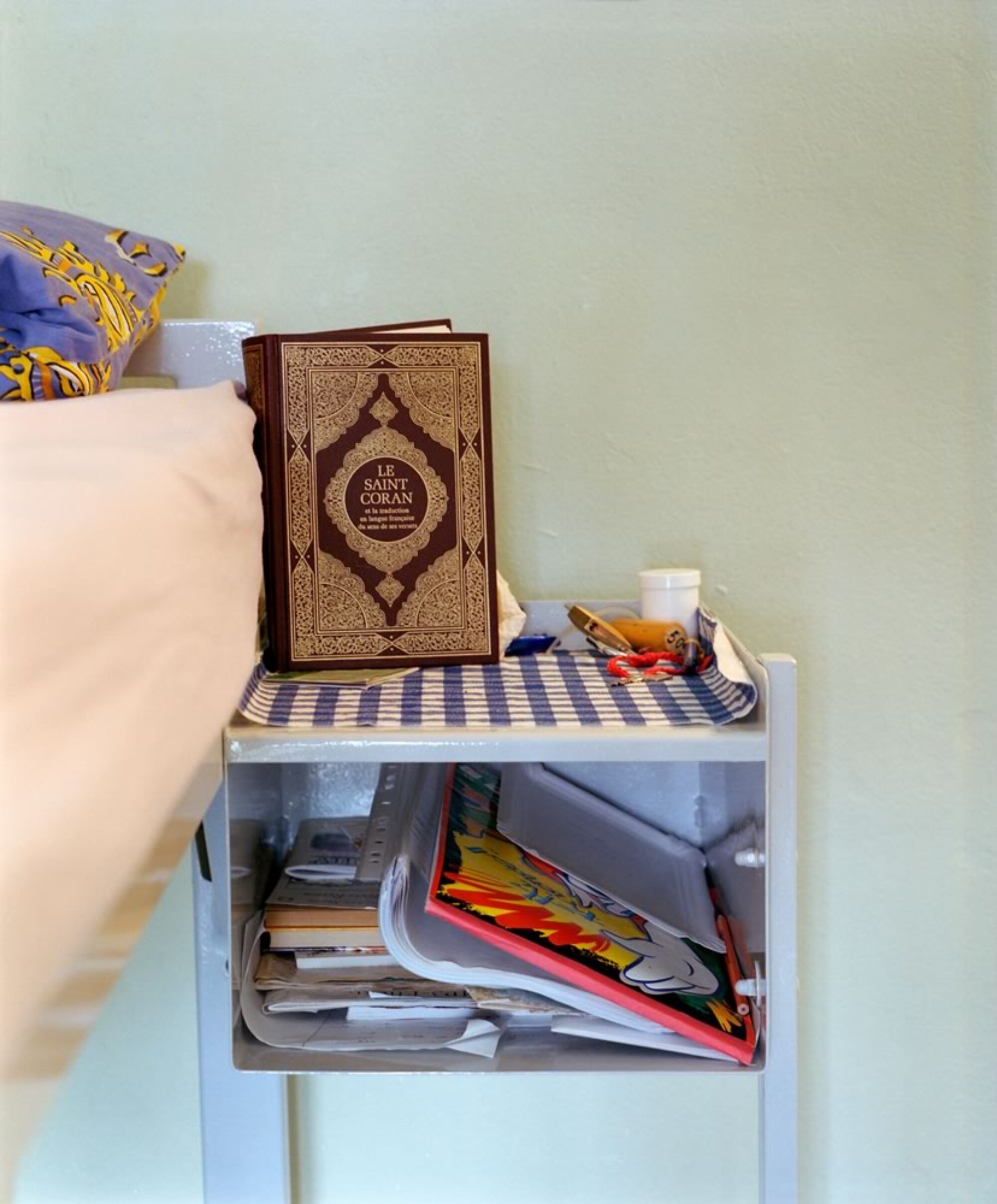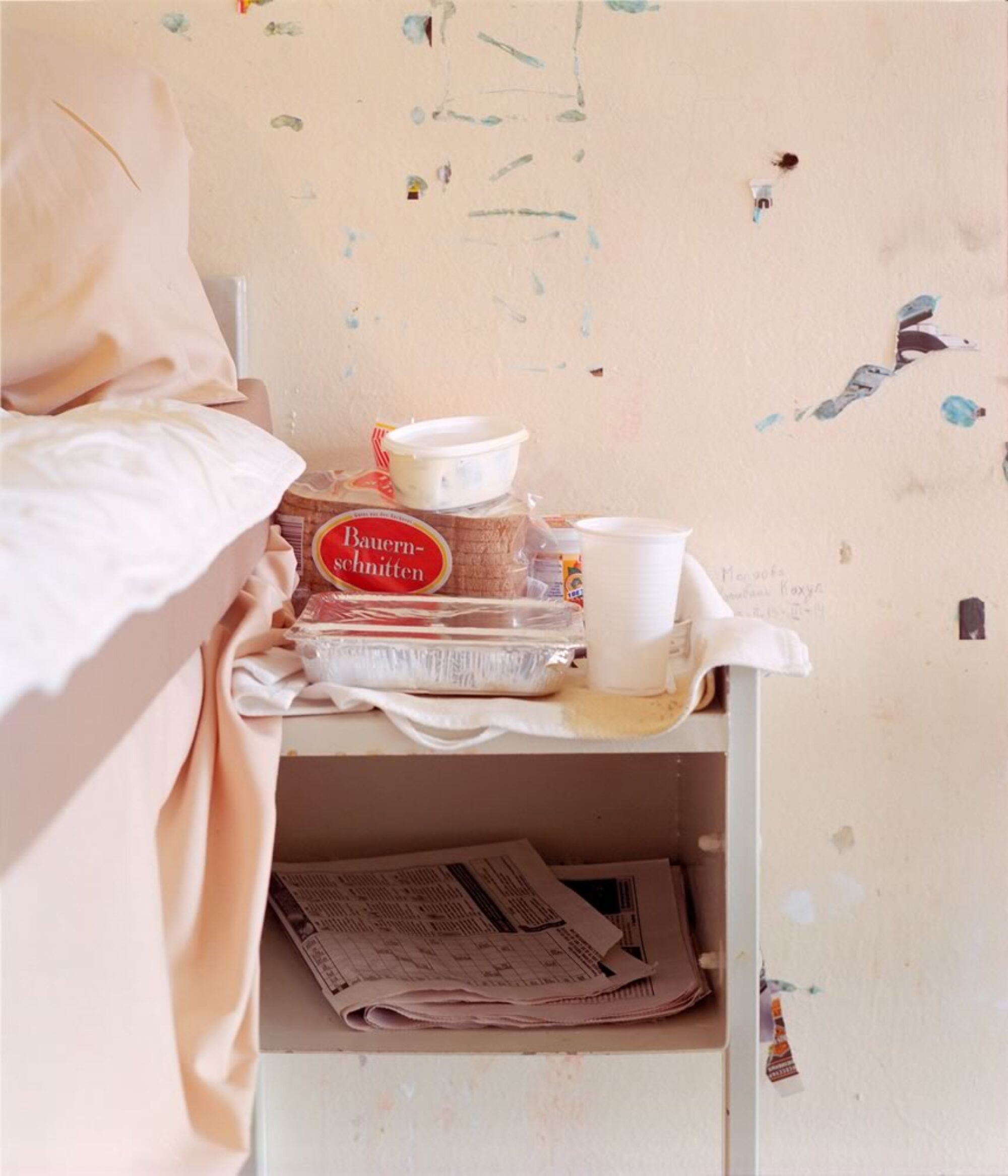 Die Fokussierung des Blicks auf die Nachttische eines Zentrums für Asylsuchende gewährt Einblick in die Intimität der Migranten. Diese Intimität in den kühlen Schlafräumen spiegelt sich in wenigen persönlichen Gegenständen wieder. Eine Haarbürste, ein heiliges Buch, eine Wasserflasche, Ikonen, Essen, Zahnpasta, das ganze Hab und Gut muss auf einem Nachttisch Platz haben. Durch die Abwesenheit des Subjektes setzt der Fotograf den Akzent auf die Natur der Sache, die in seiner Arbeit als Ausdruck der “ Condition Humaine “, der Kultur und der Identität fungiert: die Hygiene das Essen, die Religion und der Wille, sich anzupassen. Die kleine Anzahl der persönlichen Sachen weist zudem auf alles hin, was fehlt, was im Herkunftsland verlassen werden musste oder verloren ging, und zwar sowohl betreffend materieller wie auch immaterieller Werte. Doch diese Objekte stehen eher zufällig im Zentrum der Aufmerksamkeit und bringen so die Abwesenheit viel stärker zum Ausdruck. Indem Alexander Odermatt die Komposition ihres Hauptelementes beraubt, gelingt es ihm, unser Interesse auf das Individuum und sein Leben als Asylsuchender zu ziehen. Dieser bleibt unsichtbar, weil er sich versteckt und weil er nicht der Norm entspricht, aber vor allem, weil wir ihn nicht sehen wollen, so wie er auch in den Augen der Grenzwache und des Gesetzes nicht existiert. So drückt der Künstler die Schwierigkeit des Seins, des Existierens, des Auslebens der eigenen Identität in Übergangssituationen wie der Migration aus. Das Dekor der Porträts, wie auch die Gegenstände, verraten die Mittellosigkeit der Asylsuchenden; die Einfachheit des Mobiliars, die Kälte des Metalls, die weissen Wände unterstreichen den formellen und funktionellen Charakter des Ortes, neutral, kalt, provisorisch. Hier lässt man sich nicht nieder. Der minimale Komfort, der den Personen zusteht, lässt keinen Raum für den Ausdruck eigener Identität und Kultur. Dennoch, wenn wir genauer hinschauen, erweisen sich die verblassten Flecken an der Wand, als Reste von Poster und Fotos. Es sind Schriftzüge, die vom menschlichen Reflex zeugen, eine Spur zu hinterlassen, zu sagen, wer man ist, und dass man an diesem Ort vorbei kam; Ausdruck eigener Identität. (Anne Froidevaux)