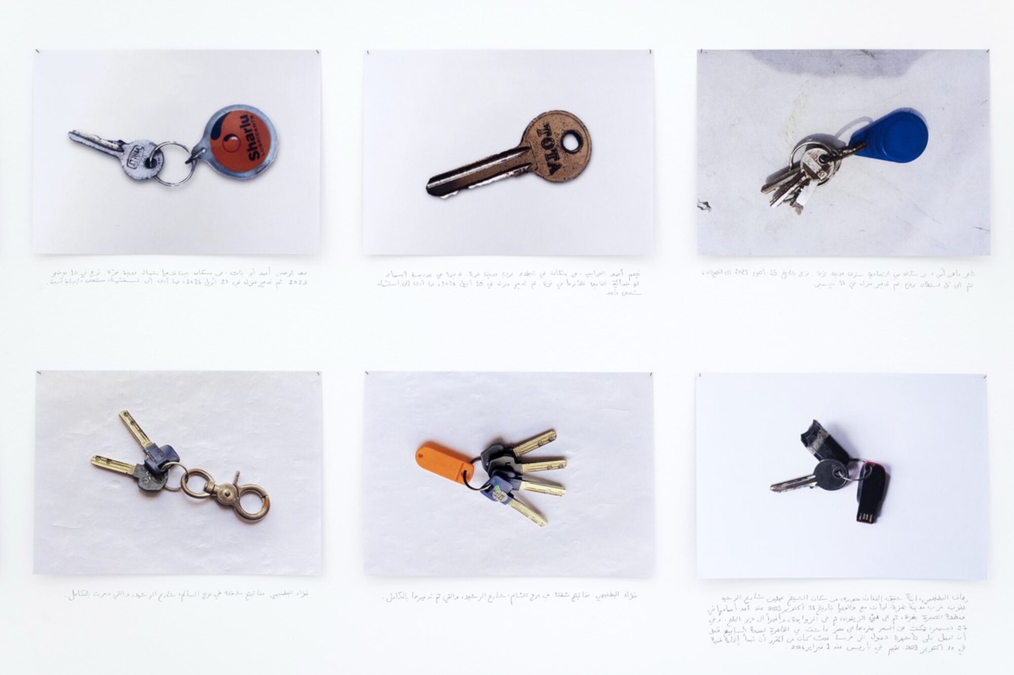 With Au cas où #2, Taysir Batniji continues a deeply moving exploration of loss, exile, and the fragility of home in the face of geopolitical violence. Composed of 90 photographs (five rows of eighteen images) of keys accompanied by handwritten accounts, the work presents ordinary objects that have become the last remnants of homes destroyed during Israeli bombardments in Gaza. The key—a recurring motif in the artist’s practice—functions here as a paradoxical symbol: the promise of a return that has become impossible, a material trace of a vanished space, a silent testimony to a life suspended. Each image, paired with a precise biographical fragment—name, place, date of destruction, forceddisplacement—anchors the work in a painful temporality where the intimate intersects with history.