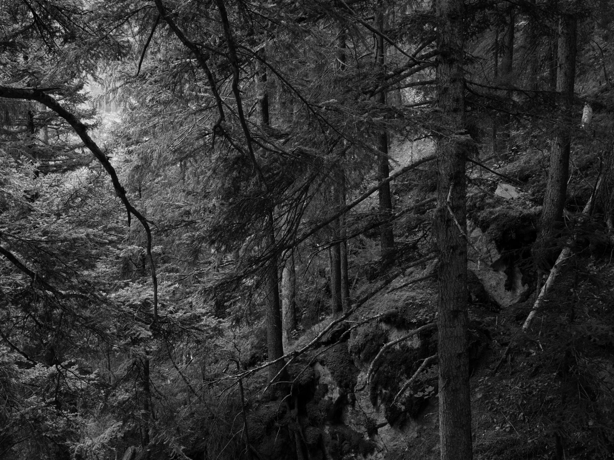 In the face of the climate crisis and the irreversible destruction of original ecosystems, these landscapes emerge as territories of resistance, while also functioning as sensitive archives of a threatened world. Between light and darkness, growth and decay, a perceptual field opens in which the survival strategies of a nature guided by a slow, evolutionary, and non-anthropocentric intelligence become visible. The forest thus becomes a mirror of our own existence — a place that recalls the deep entanglement between human destiny and natural habitats. It invites reflection on vulnerability as strength, on resilience as process, and on the necessity of an attentive, respectful, and caring gaze. The photographic work links the outer landscape to an inner, mental, and sensory dimension. Between the shadows, liminal spaces emerge in which the image makes visible what escapes language: the diffuse, the fragile, the unsayable.