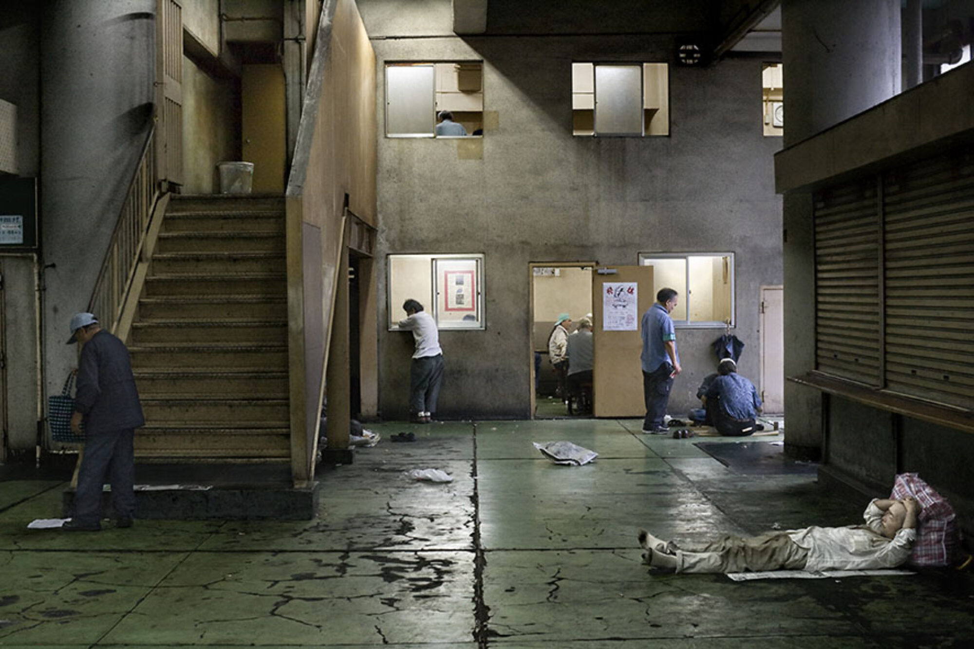 Since the economic decline of Japan, the district has become centre to the largest concentration of homeless and unemployed people in the country. The employment office is like a theatre for scenes of people waiting in vain for work and pursuing their empty activities.