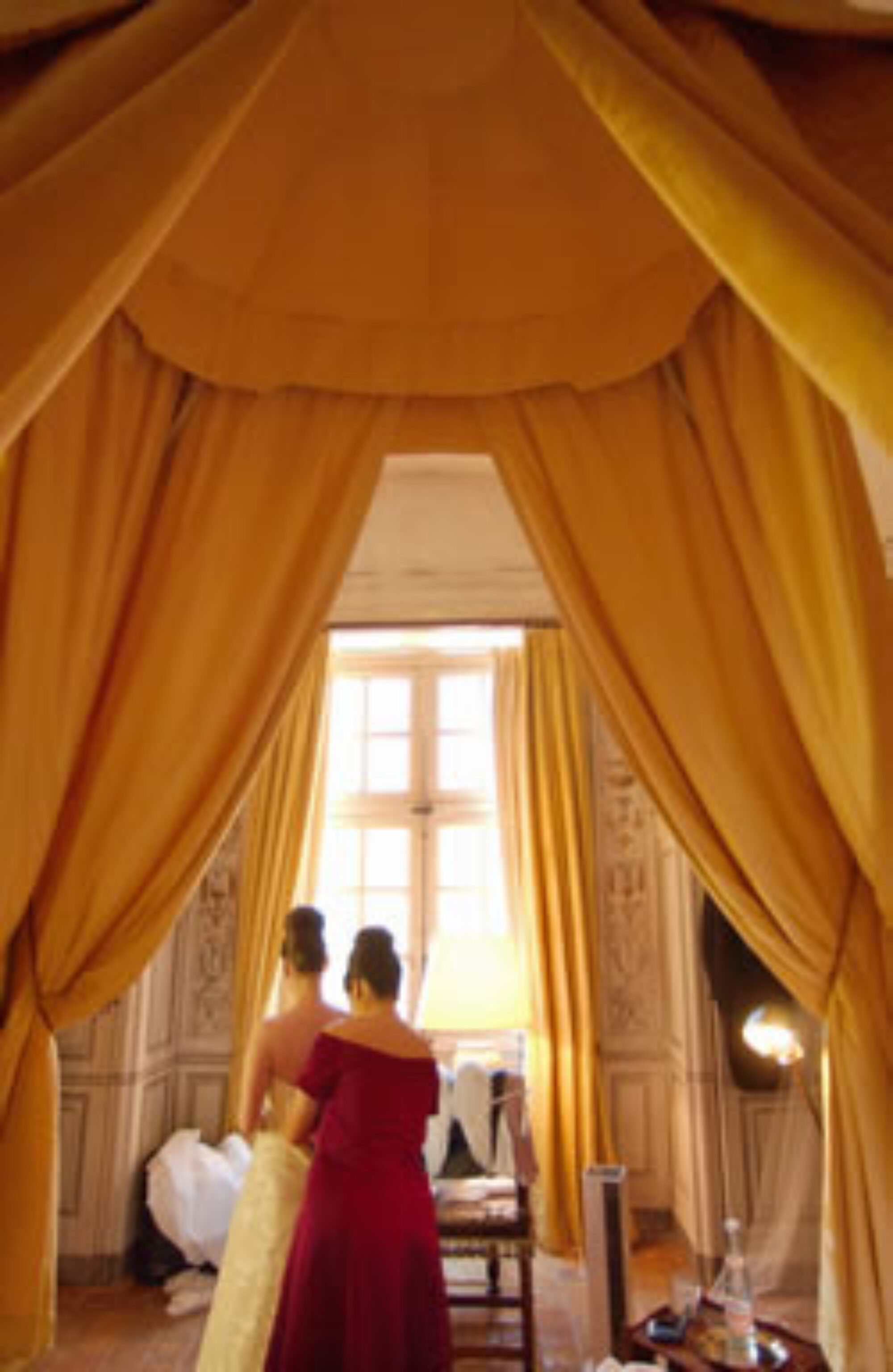 Le jour du mariage est de grande importance pour beaucoup de personnes. Pour la première, et parfois l’unique fois de leur vie, elles sont le centre d’intérêt. Un mariage est aussi un événement particulier au sein de l’histoire familiale. Une fois, j’ai lue une histoire qui montre combien il est important de fixer les mariages par l’image. Sur le chemin du retour d’une noce, les deux frères de la mariée se sont tués dans un accident ; les photos qui avaient été prises la veille avaient tout à coup une tout autre signification. Je trouve beau quand un couple réalise son rêve de mariage. Pour l’exposition, j’ai choisi deux reportages. Barbara Göldi et Jan Martell se sont mariés en été 2002 à Saint-Gall, en Suisse. L’été suivant, le frère de la mariée, Andreas Göldi, et Bettina Hein se sont mariés en France. Barbara Göldi et Jan Martell ont fait documenter leur mariage de façon systématique. Le jour, fut photographié, filmé, et même décrit par un auteur. Les invités furent dessinés par un artiste. Bettina Hein et Andreas Göldi avaient organisé leur mariage dans un château dans le Beaujolais. Là-bas, ils firent la fête pendant trois jours. Les hôtes ne furent pas seulement gâtés sur le plan culinaire, on s’occupa aussi d’eux de manière remarquable. On pouvait se faire masser maquiller on coiffer. Les amis du marié, les « grooms » et les amies de la mariée, les « brides » portaient les mêmes habits. Le couple réalisa avec ce mariage de rêve un souhait de longue date pour lequel il avait expressément épargné.