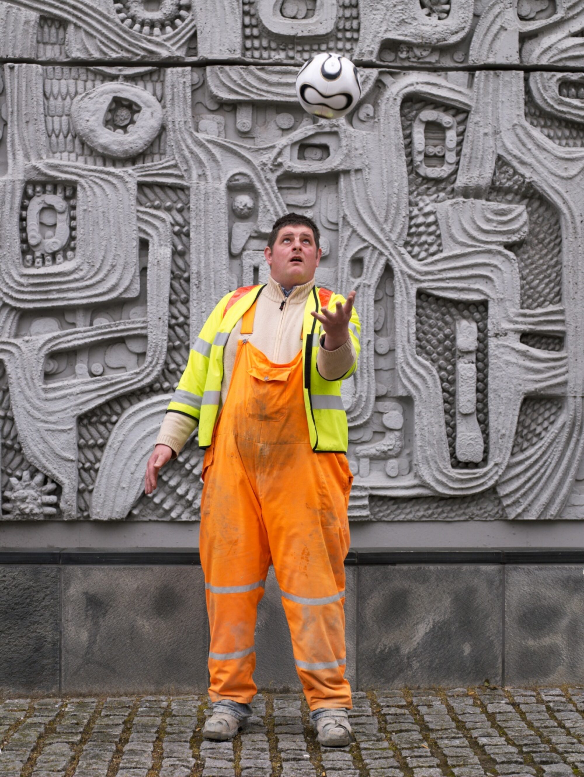 La série Stand-ins convainc d’emblée par sa perfection formelle. Chaque personne représentée est positionnée au centre de l’image et intégrée dans son propre environnement. Le cadrage est soigneusement choisi, le tout apparaît propre, calme et clair. Nous pourrions penser qu’il s’agit d’une série de portraits classiques, mais un certain nombre de détails emplis d’humour viennent contrecarrer l’aspect sérieux de la composition. Il y a indéniablement une part de spontanéité, d’inachevé et de provisoire dans ces images. Il est habituellement impensable qu’une personne sur un portrait représentatif ait les yeux grands ouverts ou totalement fermés, ou qu’un ballon lui masque la tête. Ceci devient justement possible dans la série Stand-ins de Bertschi. Les photographies oscillent entre mise en scène parfaite et prise sur le vif, laissant le spectateur dans un doute constant.