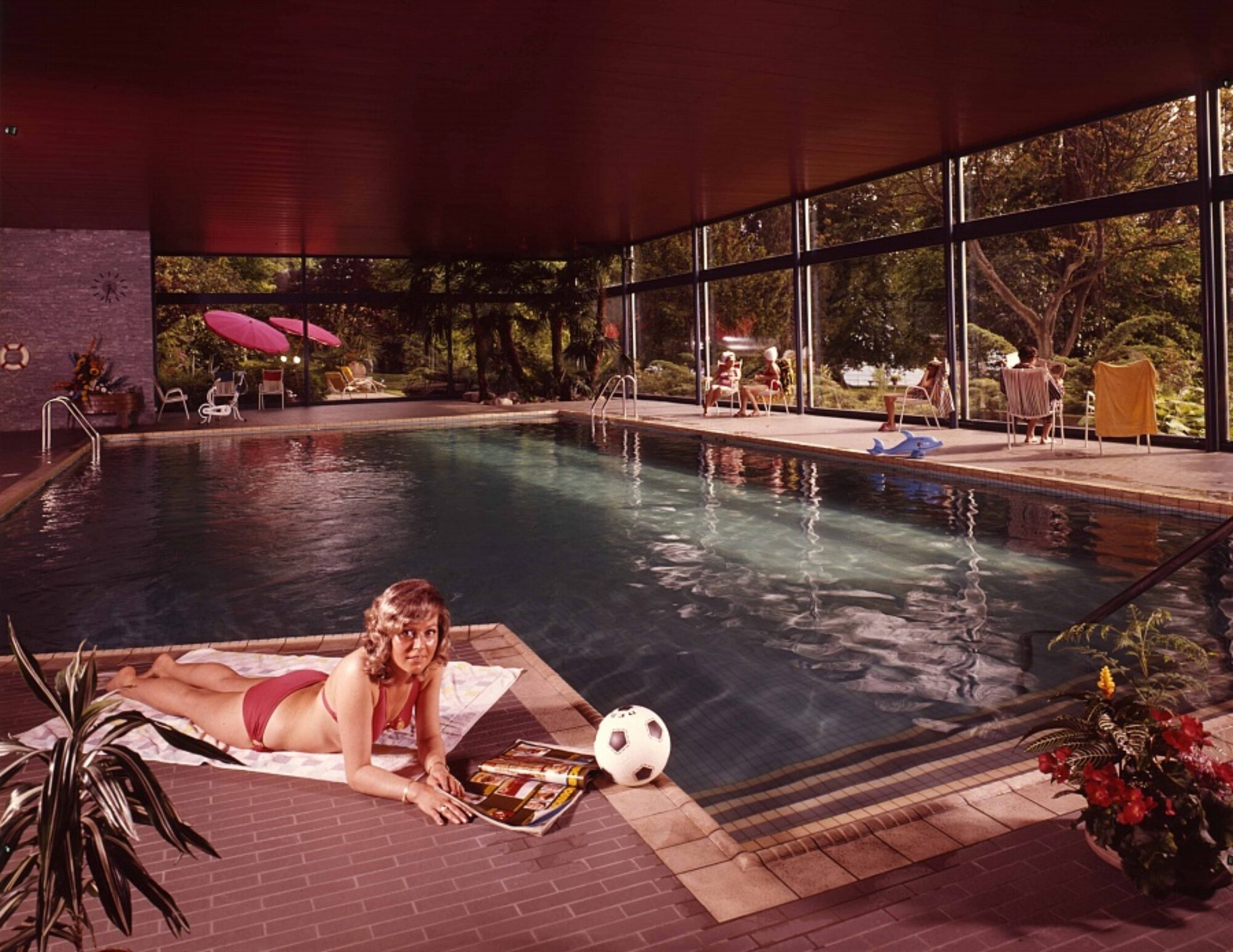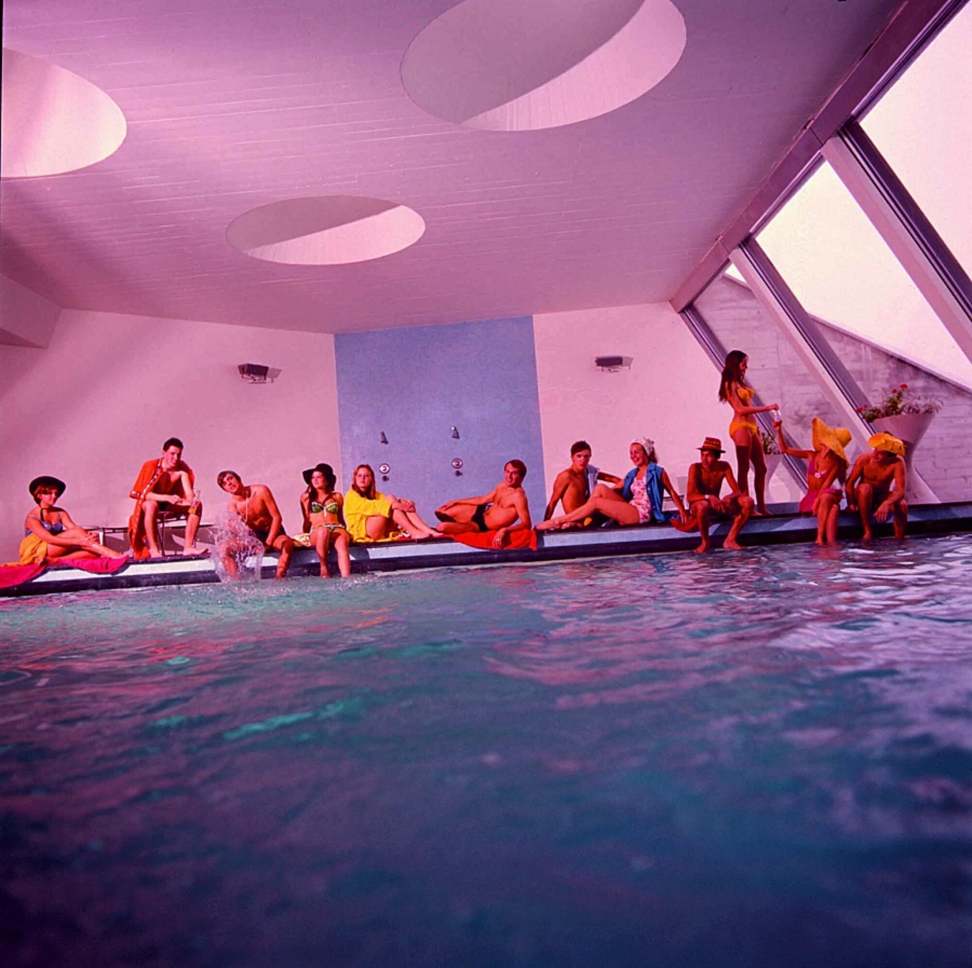 Les images invitent à un voyage en Suisse, au travers de piscines d’hôtels des régions de montagne. La construction de piscines d’hôtels se développe dans les années 1920 en Suisse, afin de remédier à la crise en premier lieu, puis plus tard pour contrebalancer la popularité du tourisme d’hiver. D’abord sportives et fonctionnelles, leur taille diminue et leurs formes varient au cours des années 1950. A partir des années 1960, les moyens techniques et financiers permettent la construction de piscines couvertes et d’ainsi compenser les variations de fréquentation saisonnière. Les mises en scène suivent le langage typique de l’entreprise Brügger. Leur charme rétro est encore accentué par les changements de couleur subis au fil du temps.
