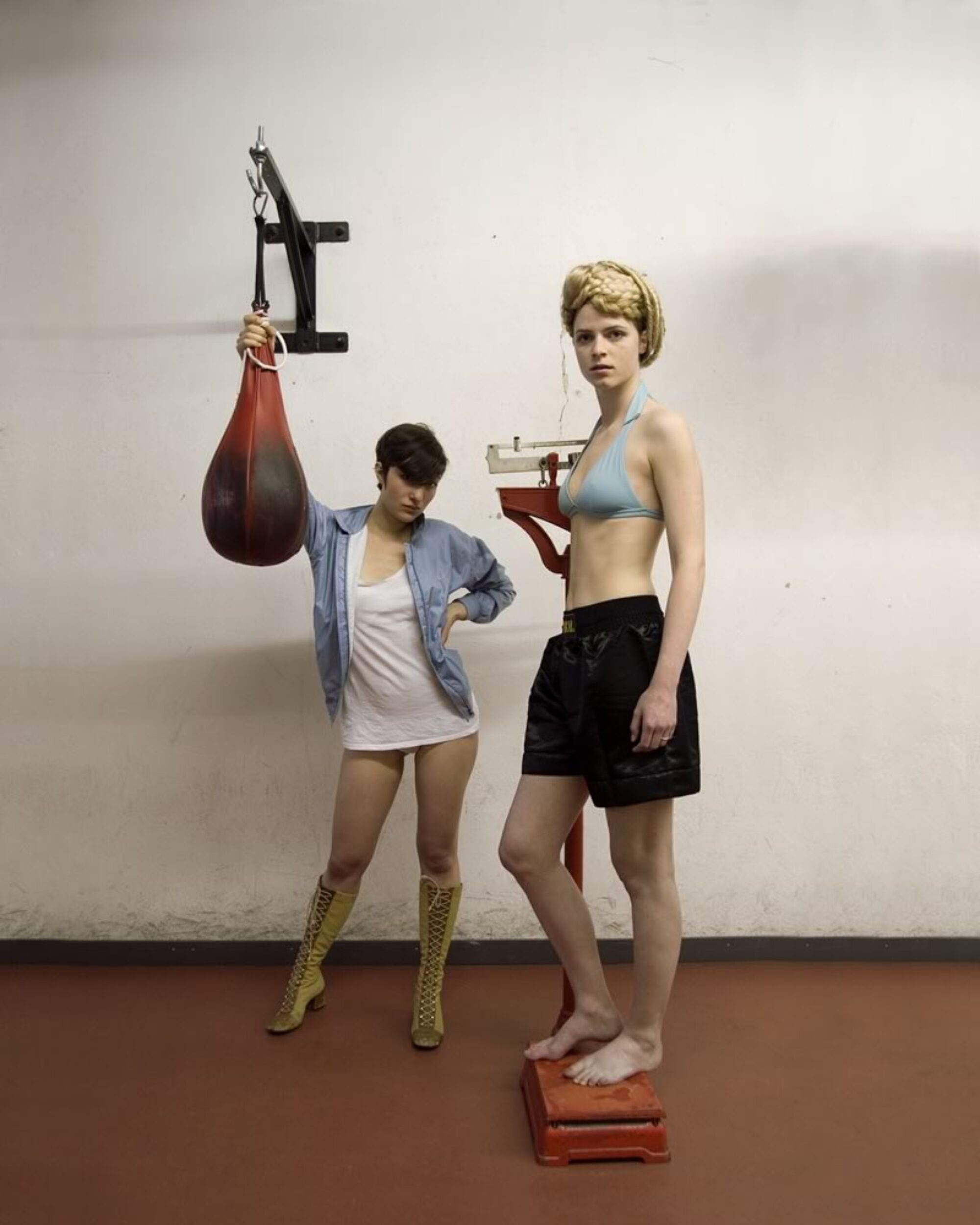Comme le remarquait Barthes dans ses “Mythologies “, tout combat de boxe partage avec le catch une dimension grandiloquente et hautement spectaculaire. Il suffit de mentionner le cirque médiatique généré par l’historique combat entre Ali et Foreman à Kinshasa ou les spectaculaires combats au MGM de Las Vegas. Cependant, contrairement à un combat de catch qui impose au public une lecture immédiate et emphatique de chaque geste, un match de boxe est une histoire qui se construit en permanence sous les yeux des spectateurs. Tout mouvement s’inscrit ainsi dans la durée de l’événement, s’étendant toujours vers le couronnement d’une issue, dans l’”avenir rationnel du combat” dans lequel le résultat reste inintelligible jusqu’au son de la cloche qui annonce la fin du dernier round. Le ring est de fait le lieu de l’affrontement, synonyme du combat corps à corps et du défi sans merci ; confrontation physique qui implique autant d’érotisme que d’héroïsme, dans laquelle les pugilistes s’esquivent et se rapprochent sans cesse dans le but ultime de terrasser définitivement l’adversaire. À l’origine, des jeux funèbres organisés en l’honneur des victimes de guerre, décrits par Homère dans l’”Iliade” (XXIII) et discipline olympique à partir de 668 avant J.-C. le pugilat s’est depuis ses débuts chargé d’une dimension mythique qui perdure dans les arènes contemporaines. Dans cette mythologie uniquement masculine, les femmes n’ont longtemps occupé qu’une place accessoire en tant que femmes / images, objets en exhibition entre les rounds à regarder par un public enthousiaste et excité. Dans cet univers où la testostérone s’érige en maître incontesté, Anja Schori donne la parole à des boxeuses qui, dans ce monde, ont sûrement leur mot à dire. Des cadrages serrés sur un vieux gant de cuir ou des punching-balls déposés dans un coin de la salle ; des images représentant des séances d’entraînement intense alternent aves des images plus intimistes dans lesquelles les sous-vêtements abandonnés dans les vestiaires apparaissent tels des vestiges d’une victoire consommée dans un ring désormais déserté.Anja Schori se plaît à jouer avec les symboles hérités d’un monde de guerriers et à détourner avec subtilité et une certaine ambiguïté les clichés qui peuplent d’une manière ou d’une autre l’imaginaire masculin : des portraits en noir et blanc qui rappellent ces magnifiques pin up des magazines des années 1950, des femmes en tenues sexy et minimales qui offrent à l’objectif leurs corps toniques et sensuels telles des mannequins pendant un “shooting” de mode, mais surtout des sportives qui s’imposent avec une détermination exemplaire dans un monde nostalgique et fortement patriarcal. Par ailleurs, les quelques hommes photographiés apparaissent dans des rôles paradoxalement marginaux et souvent relégués à des fonctions simplement auxiliaires. Les images de différents formats et hétéroclites se succèdent le long des nombreuses pages d’une édition volontairement précieuse qui renvoie sans détours à ces magazines de papier glacé dans lesquels des images publicitaires impeccablement élaborées côtoient des clichés documentaires aux couleurs luisantes. L’attention portée par la photographe à la mise en page raffinée et au “layout” qui invite le lecteur / spectateur à une lecture rythmée et dynamique, confère au travail une dimension intermédiaire entre le documentaire et le reportage de mode. D’autant plus qu’une attention particulière est donnée à la typographie des citations agencées d’après une logique qui s’apparente de manière certaine à celle qui caractérise les reportages des magazines glamour. L’aspect social et celui clairement plus esthétisant de la photographie de mode se suivent, se mêlent et se confrontent grâce à une habile variation des formats et des cadrages ainsi qu’à une variation formelle avisée des tirages. Dans le souci de ne pas s’astreindre aux codes qui imposent traditionnellement le noir et blanc au style documentaire et les couleurs saturées à la photographie de mode, Anja Schori brouille les frontières, survole les genres et redéfinit des limites clairement plus labiles. (Patrick Gosatti)