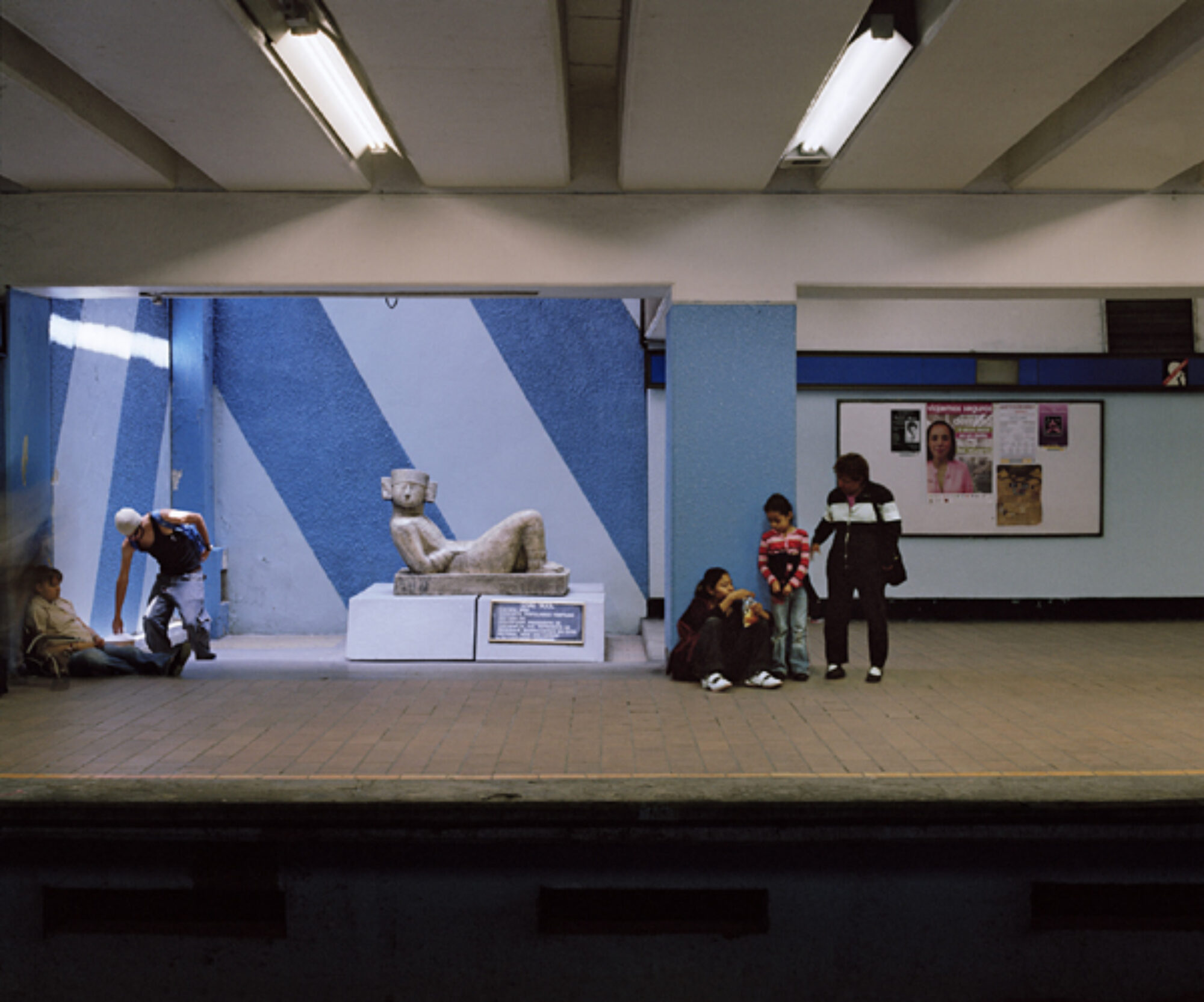 Photographier les peintures murales qui ornent les parois des arrêts de métro est une manière tout à fait inédite de traiter des questions d’histoire et de culture d’un pays. Pour approfondir ses connaissances sur l’identité mexicaine, personnelle et culturelle, Emmanuelle Bayart remonte le temps jusqu’aux origines précolombiennes en même temps qu’elle s’enfonce et erre dans les souterrains. Lieux de passage surpeuplés, les méandres des couloirs ne sont pas propices à la contemplation ; Emmanuelle Bayart a donc attendu que le flot des voyageurs s’amenuise et laisse place au décor. Avec la série “Ode au métro de Mexico”, Emmanuelle Bayart se rapproche plus de l’individu et atteint les espaces intimes de ce monde sous-terrain. Partie à la rencontre des employés du métro, elle nous livre leurs portraits et nous fait découvrir par l’image leurs lieux de travail et de repos. Le calme et l’intimité qui règnent dans ces lieux cachés contrastent fortement avec le flux des passagers arpentant les dédales des couloirs. Par enfilade, l’artiste nous propose un nouveau regard sur l’histoire, la société, le métro pour enfin arriver à l’individu. (Noémie Richard)