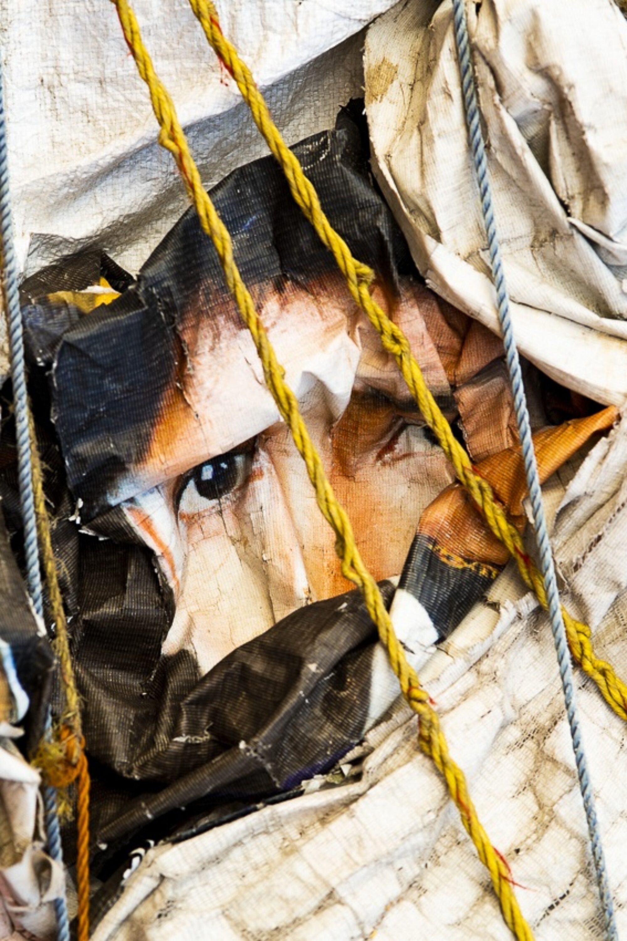 La série d’images proposée par Catherine Leutenegger est issue d’une résidence d’artiste dans la mégapole de Chennai, en Inde. Sur place, elle a photographié la deuxième vie de bâches, affiches et peintures murales, réalisées et présentées dans l’espace public : des affiches de personnes célèbres – acteur·trice·s, politicien·ne·s – ou d’inconnu·e·s – anniversaires, commémorations, campagnes publicitaires. Générant un brouhaha visuel dans lequel plusieurs univers fusionnent et se confondent, ces images se retrouvent ensuite sur les plages, pour recouvrir le matériel des pêcheurs et des petits commerçants. Réutilisées à d’autres fins, les images préalablement bidimensionnelles se muent en monticules sculpturaux tridimensionnels qui déforment les visages et petit à petit se déchirent, se délavent et disparaissent, évoquant de manière métaphorique la fragilité de l’image et celle de l’individu dans notre société actuelle.
