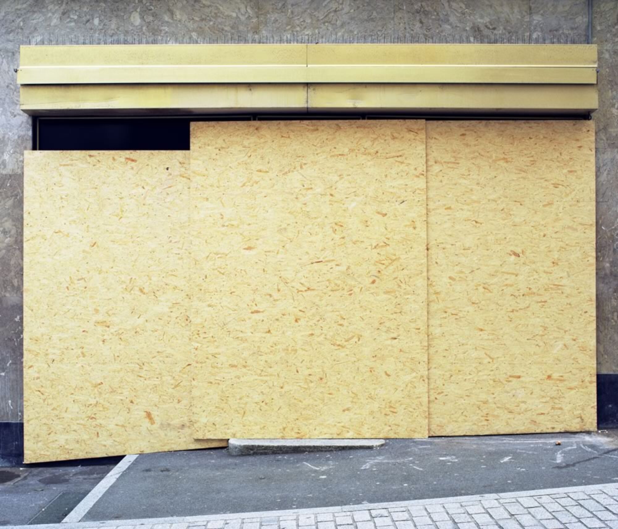 Dans les mois qui ont précédé le sommet du G8 à Evian, en 2003, les médias de Suisse romande ont manifesté une grande crainte à l’égard des violences dont risquaient de faire preuve les adversaires de la mondialisation. La presse se préoccupait principalement du coût de la sécurité publique et des questions de responsabilité dans les actes de vandalisme attendus. Le sentiment d’insécurité prit alors une telle ampleur que de nombreux magasins dans les centre-villes de Genève et de Lausanne décidèrent de barricader leurs vitrines et leurs accès pour la durée de la rencontre du G8. Nicolas Savary photographia cette situation inhabituelle et insolite. Des vitrines aveugles – ce qui était normalement fait pour séduire devenait à présent invisible et se refusait à tout regard. Au lieu d’une atmosphère éclairée et rayonnante : des panneaux de coffrage bruts. Au cadre du spectacle de la consommation se substituait ainsi celui des barricades.