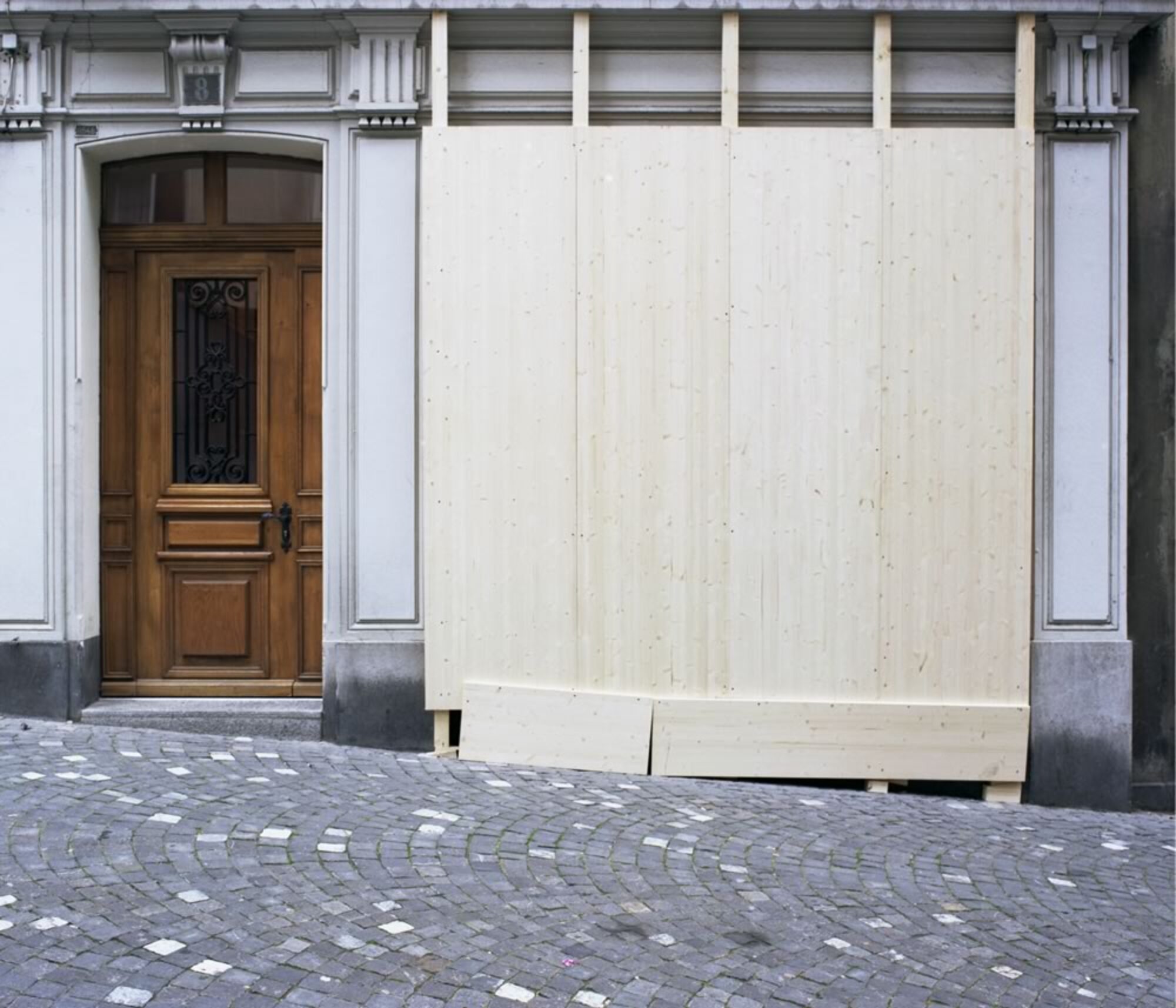 Les détails des façades sautèrent alors aux yeux : les corniches des vitrines, amoureusement sculptées autrefois, furent remises en valeur. Le noir des semelles sur le bitume montrèrent l’usure des millions de chaussures qui avaient passé par là. Des graffitis. Des architectures fonctionnelles bon marché mal dissimulées sous un mince revêtement de marbre. La confrontation d’une photo de Nicolas Savary avec le visage réel des lieux est ainsi immédiatement parlante ; il s’agit là de lieux dans lesquels nous nous déplaçons chaque jour, mais sans savoir vraiment qu’ils existent. Les centaines de mètres carrés de bois aggloméré, de contreplaqué, de panneaux de coffrage jaune miel qui nous évoquent des réalisations d’art contemporain (Christo, Wolfgang Laib) ont ici une origine tout à fait pratique. Enfin, les images de Nicolas Savary documentent les manifestations tangibles de la cupidité et de la peur. Des paysages mélancoliques s’offrent à nous. Et pourtant la réalité, libérée de l’illusion, nous réconcilie avec elle-même. (Simon Stähli)