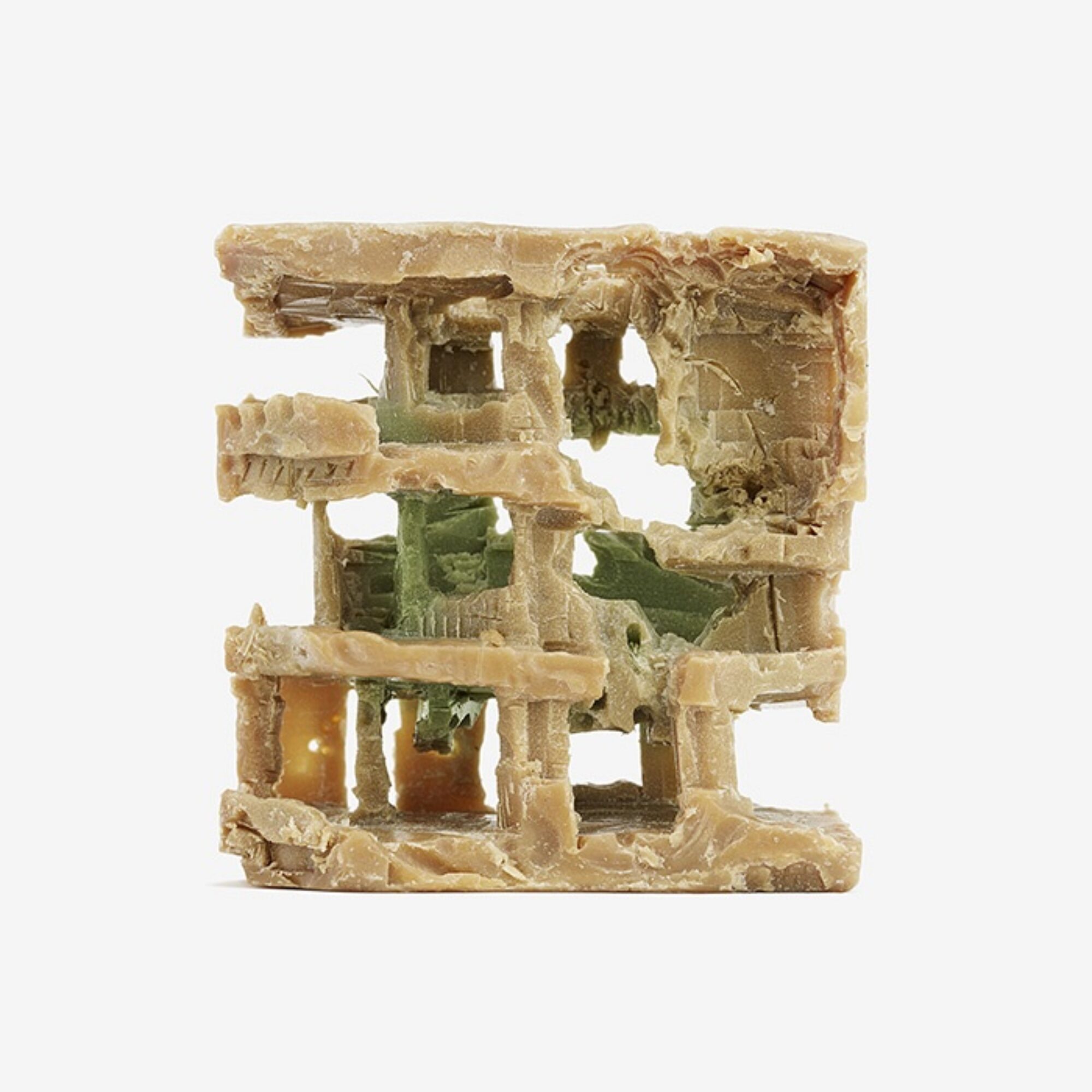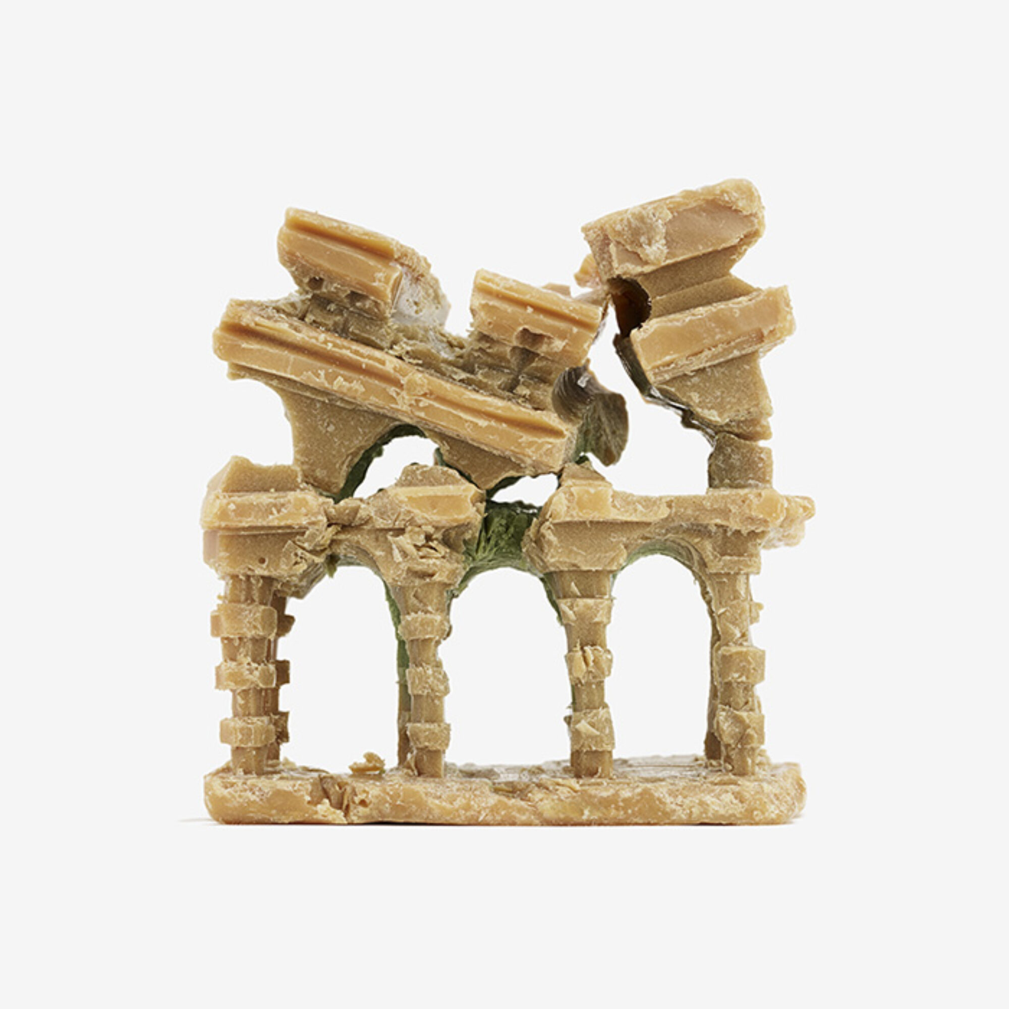 Le processus de fabrication du savon d’Alep a été élaboré au cours de l’Antiquité dans la région du Levant dont Alep était alors l’une des villes principales. Emmanuel Tussore sculpte cette matière fragile et malléable puis la photographie. Grâce à cette méthode de production, le savon d’Alep devient le symbole d’une force brute, destructrice. Les ruines qui en résultent racontent l’absence, la perte, l’exil et questionnent les valeurs humanistes. Puisant dans l’histoire pour révéler des problématiques actuelles, Tussore propose une vision du monde dans laquelle la notion de disparition est prépondérante.