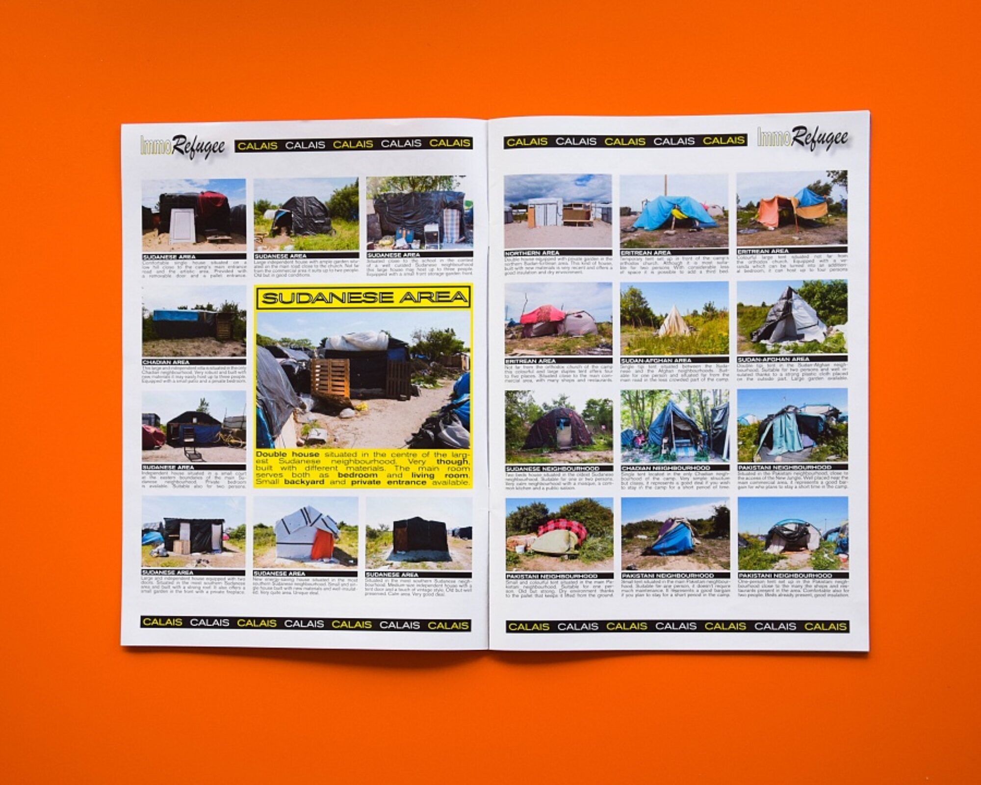 Guide utile des habitations du camp de réfugiés de Calais. La « Jungle » est un grand quartier résidentiel en périphérie de Calais, en France, entouré d’une clôture métallique et équipé d’eau courante et de lumière. Plus de 6’000 réfugiés vivaient dans les mêmes conditions que celles qui sont visibles ici. Aujourd’hui le camp est démoli. Nous avons imaginé comment nous aurions pu trouver une maison dans le camp. Derrière ce projet, il y a un travail photographique de près de deux ans. Nous avons choisi l’ironie parce que, fatigués de la façon dont les médias traditionnels et de nombreux photographes traitent ce sujet, nous pensons qu’il est nécessaire de fournir d’autres points de vue et d’autres récits.