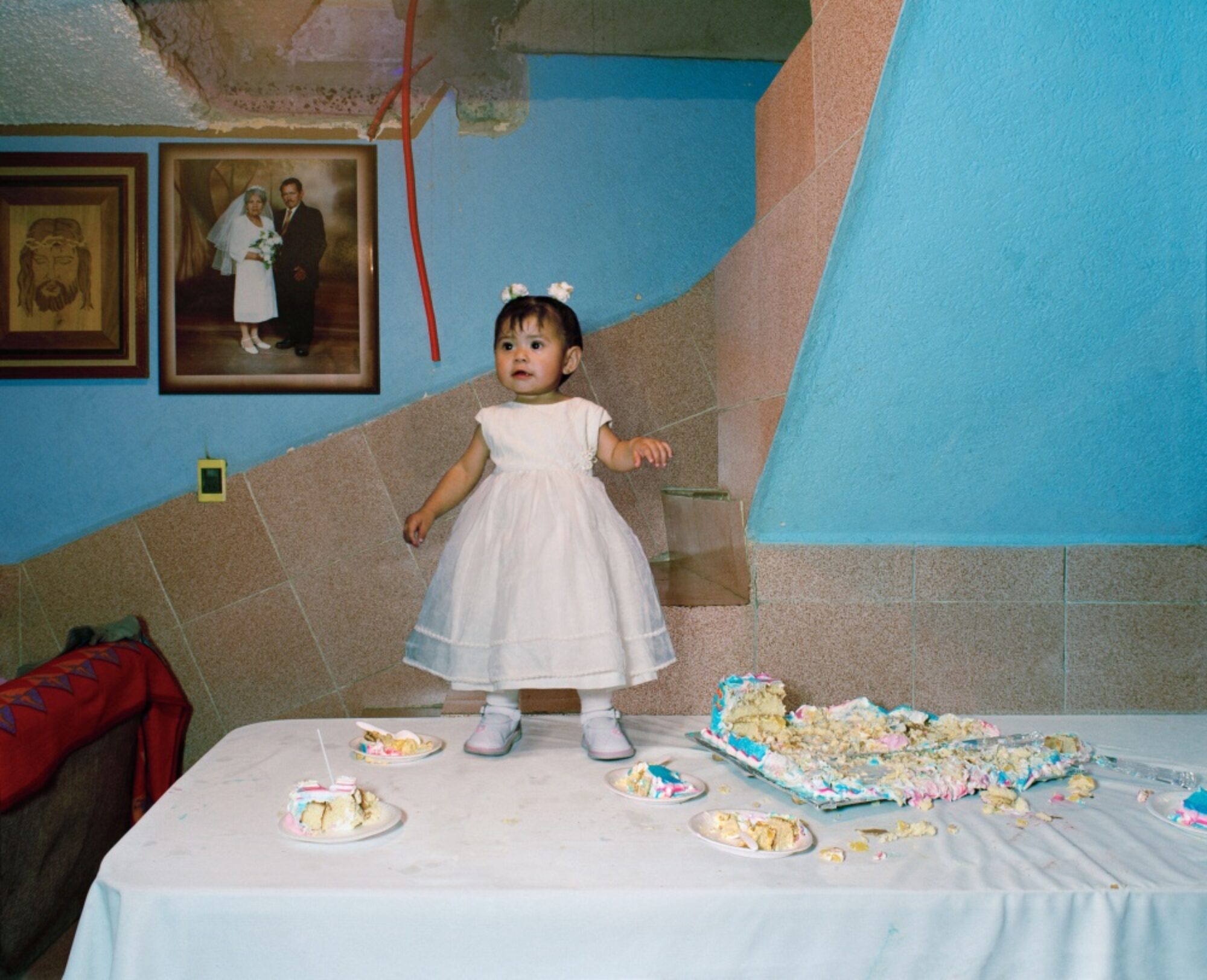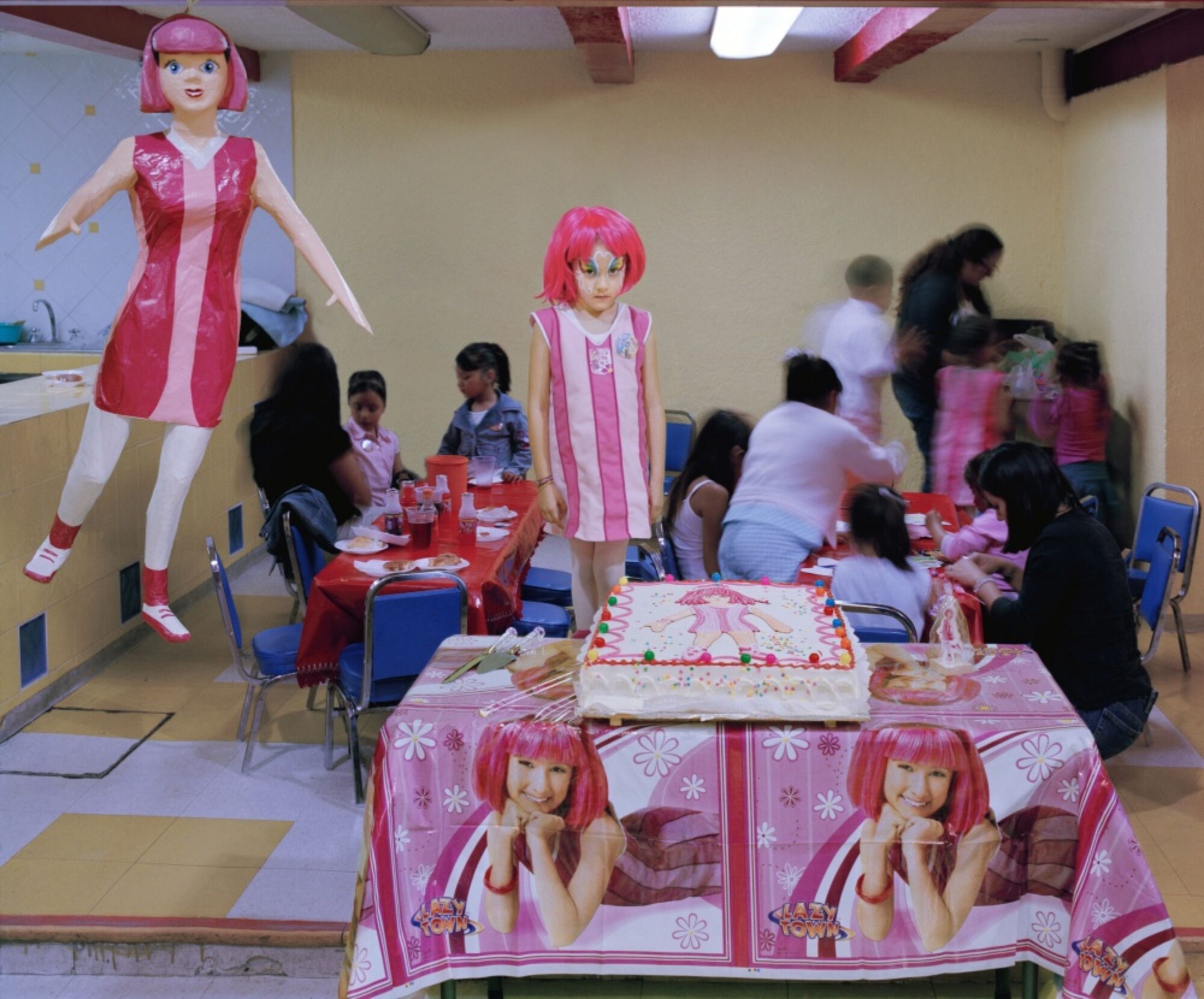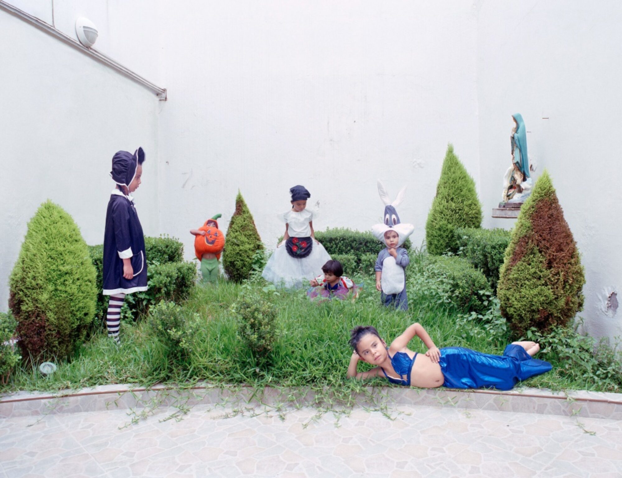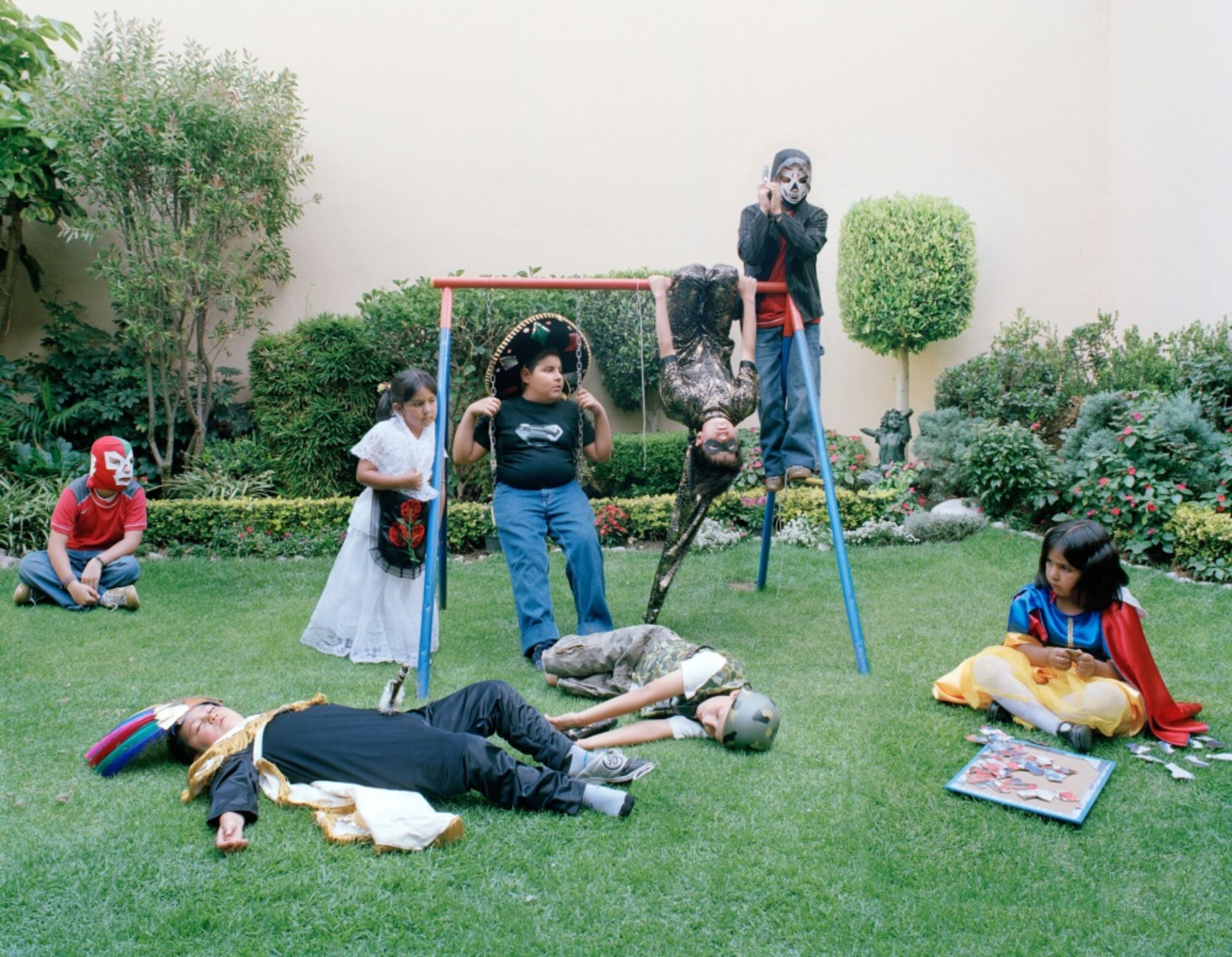 De nombreux éléments rappellent ce mélange : costume d’Indien, sombreros, piñatas (figures en papier mâché remplies des sucreries), Spiderman, courge d’Halloween ou Sainte Vierge. Comme dans le jeu du dessin caché, ces détails attirent l’attention du spectateur et le font participer aux scènes. La perspective centrale renforce cet effet d’aspiration et souligne l’unité des ensembles. Les ouvertures vers l’extérieur font exception. Elisa Larvego utilise des éléments du théâtre tels que la scène, des acteurs qui suivent des indications de mise en scène, des accessoires. Lors de la fiesta, les logements et les jardins des enfants se transforment en des mondes particuliers qui ont leur logique propre. Le niveau de la mise en scène ne réside pas seulement dans la transposition artistique, mais déjà dans la nature des fêtes et des costumes eux-mêmes. La photographe crée ainsi des images à caractère documentaire qui se situent à l’interface entre imagination et réalité.