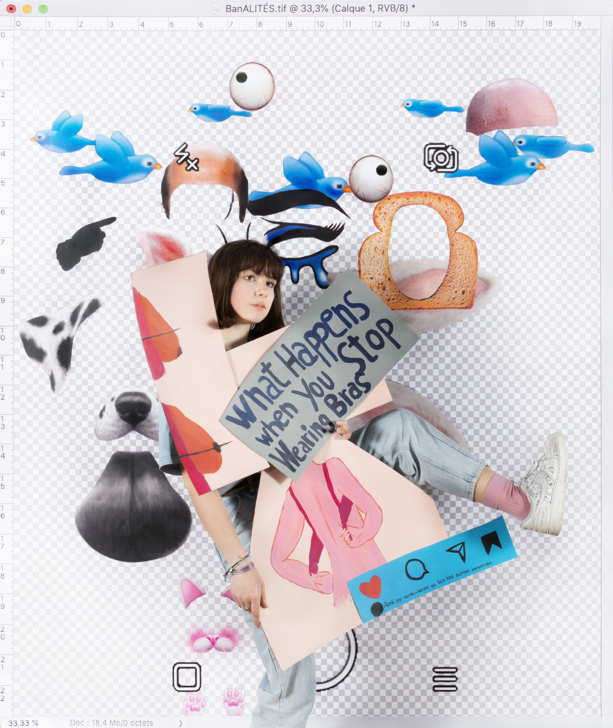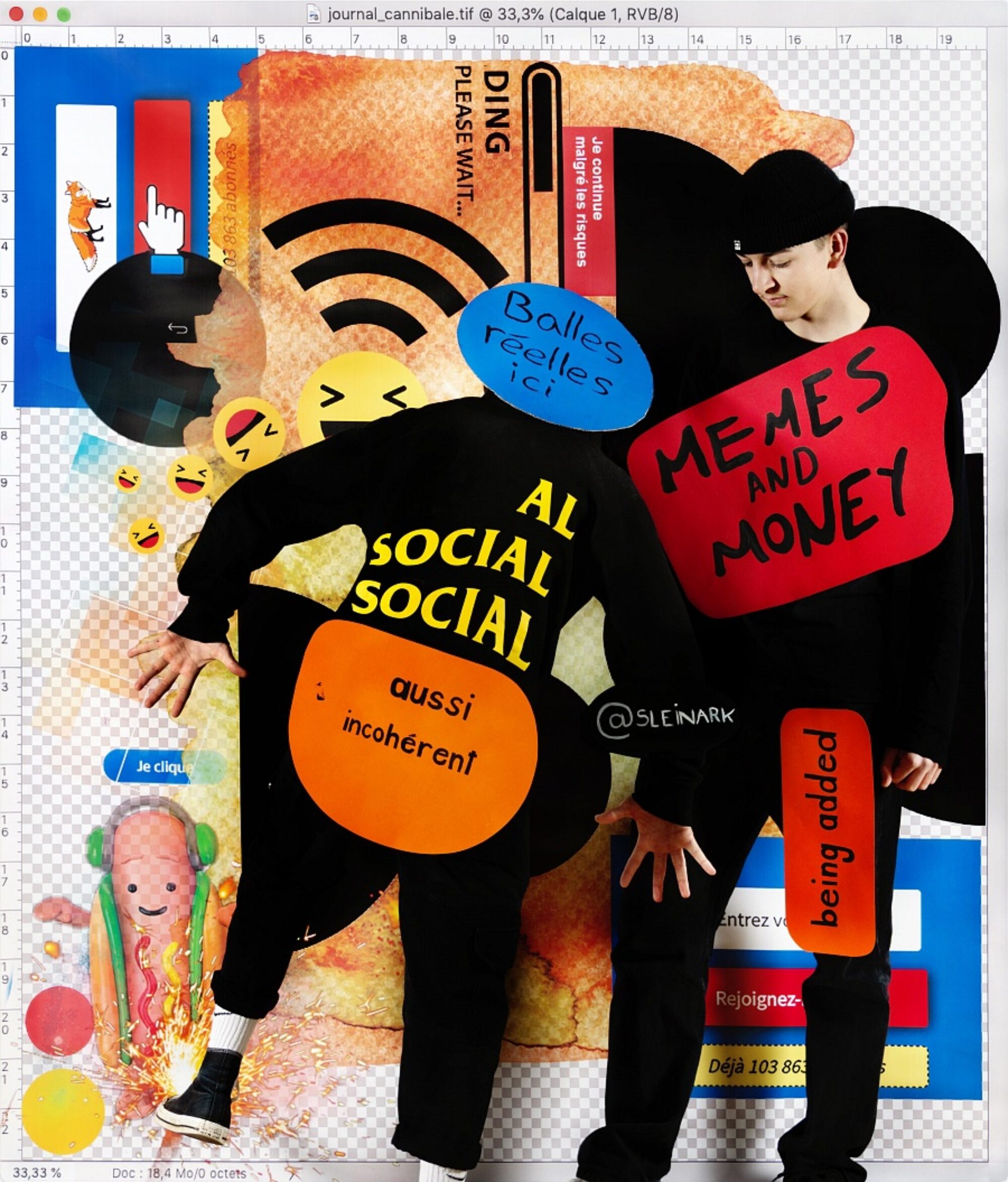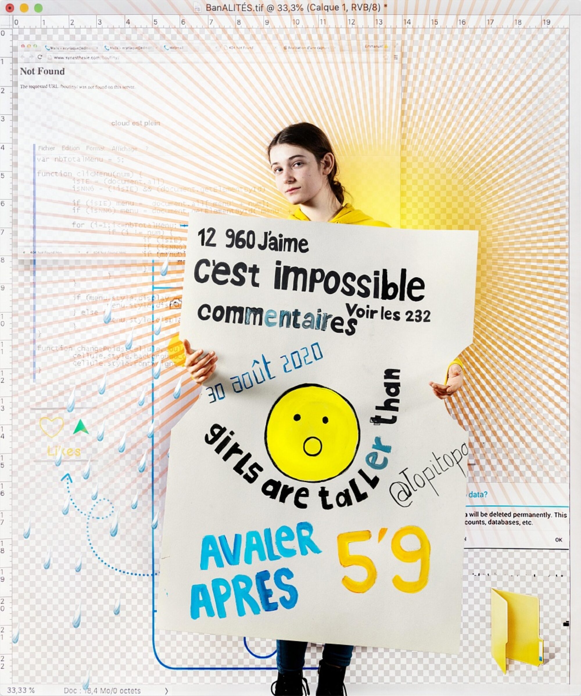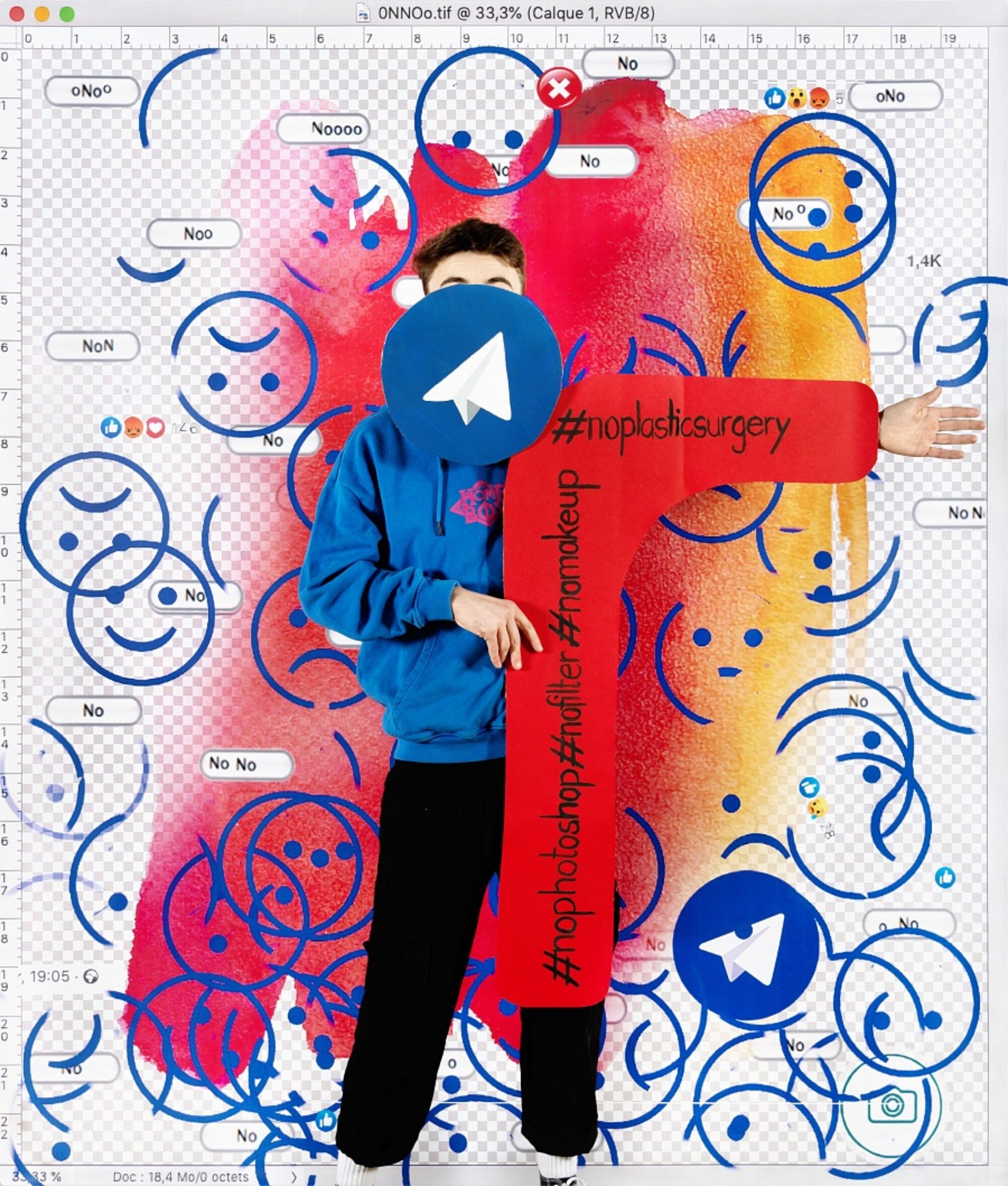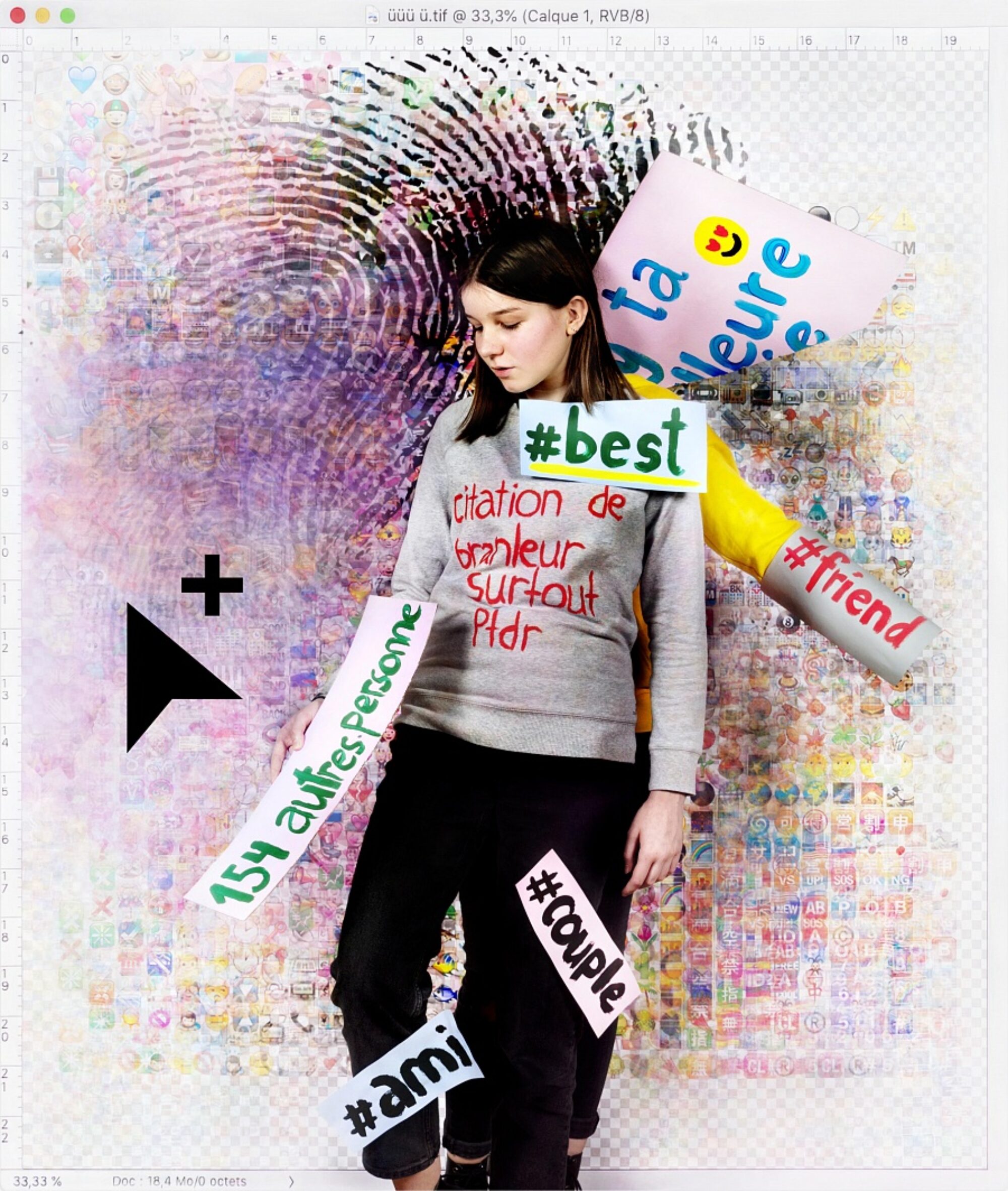 Réservoir de matières et d’expressions créatives, les plateformes digitales peuvent aussi être associées à une menace faite à notre attention et à nos libertés individuelles. Peut-on encore parler d’expression personnelle quand tout est fait pour que nous soyons captifs, pour que nos émotions se conforment à des (émot)icônes ? L’artiste Aurore Valade a invité une classe du Gymnase français de Bienne à déconstruire l’imagerie générée sur les réseaux sociaux à travers des techniques analogiques et numériques. Les élèves ont travaillé à partir de captures d’écrans tirées de leurs propres préoccupations et interactions sur les réseaux sociaux. Ensemble, ils ont découpé, dessiné et retravaillé le langage 2.0 à travers des techniques analogiques et numériques. Ils ont créé des symboles avec lesquels ils se sont mis en scène puis photographiés. Les images qui résultent de cette collaboration redonnent une plasticité aux émotions et aux revendications des élèves à travers un geste pictural et théâtral, la photographie permettant de conserver une mémoire graphique d’interfaces numériques fragiles, souvent vouées à la disparition. L’installation proposée invite le public à se mettre lui-même en scène dans l’espace d’exposition.