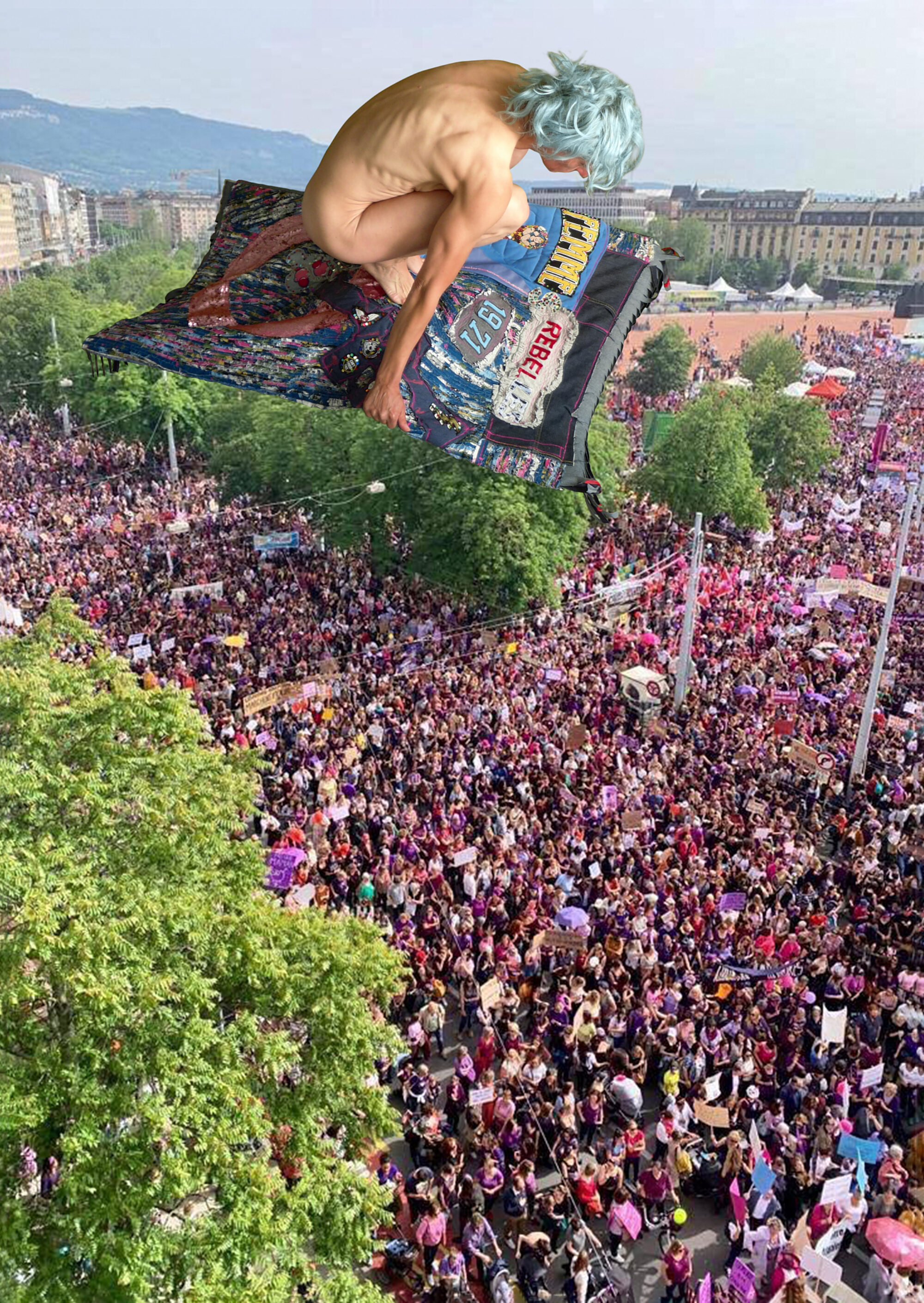 Le tapis, objet domestique et décoratif, devient un espace performatif de résistance, où le corps féminin se réapproprie symboles et territoires. Ces interventions jouent d’un déplacement subtil entre hommage, ironie et réécriture critique, révélant la porosité entre héritage militant et enjeux contemporains. La fragilité des corps exposés, la précarité des droits, mais aussi la puissance des gestes partagés constituent le cœur de cette œuvre, où mémoire et présence s’entrelacent pour faire émerger un espace critique, poétique et profondément politique.