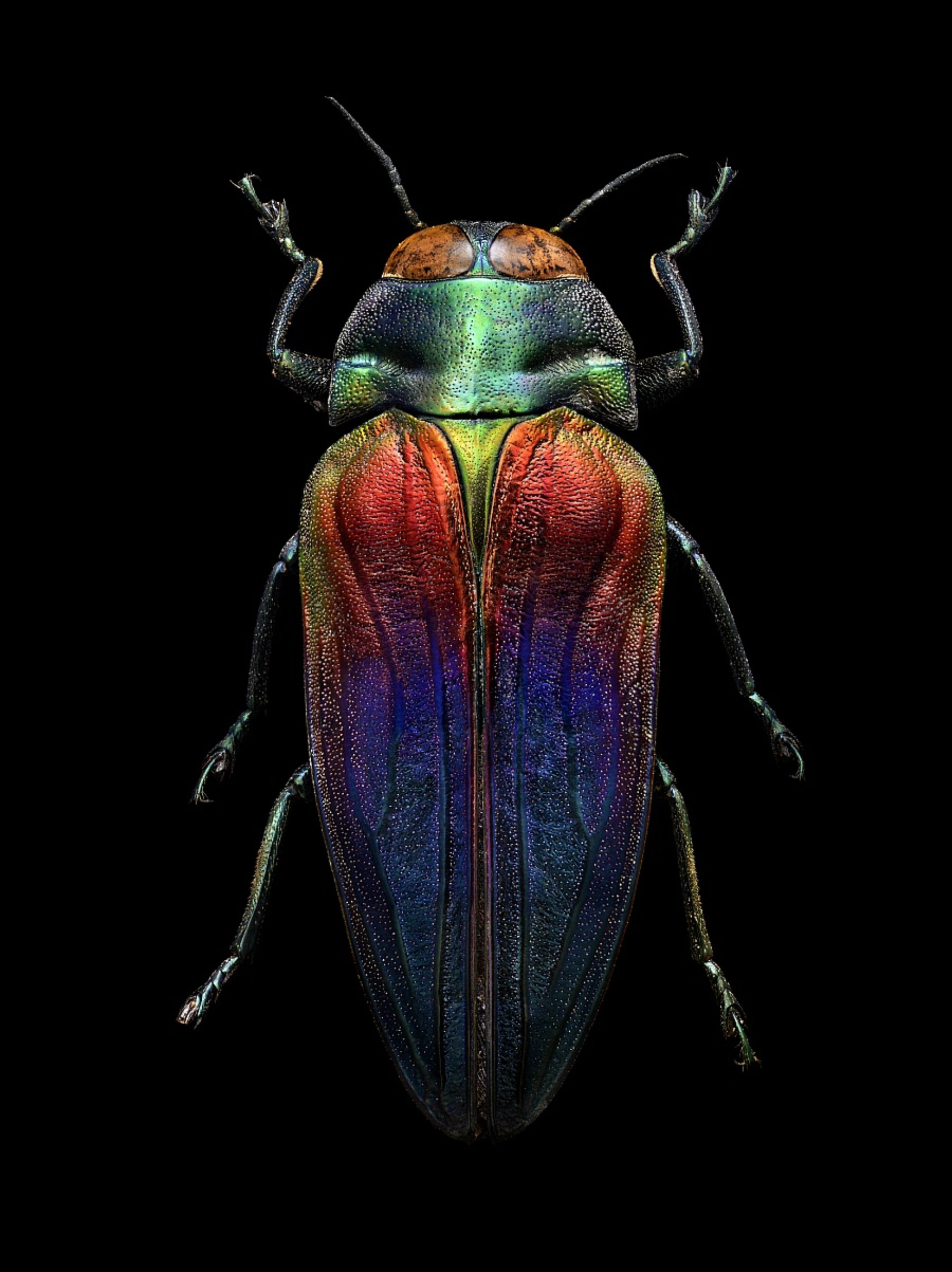 La plupart des insectes ont été photographiés en 30 sections, chaque partie étant éclairée différemment par une lumière stroboscopique afin de renforcer l’aspect visuel plastique de chacune des zones du corps de l’insecte. Chaque portrait d’insecte a été recomposé à partir de plus de 8000 clichés individuels.