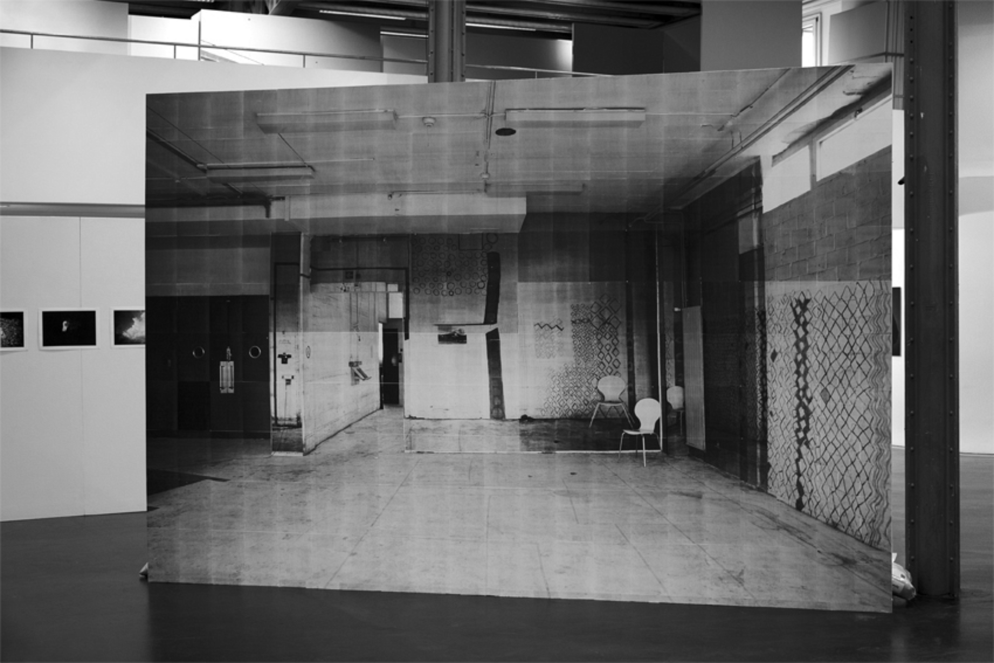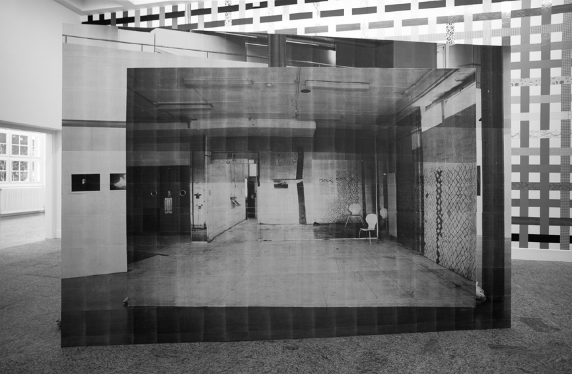 « Options for Walls » est une appropriation spatiale au moyen de la représentation photographique. La photographie d’une paroi (exposition « Transform », 2013) a été mise à l’échelle des dimensions de la surface photographiée, puis imprimée (laser) en noir-blanc au format A4, montée et tapissée sur la même paroi.