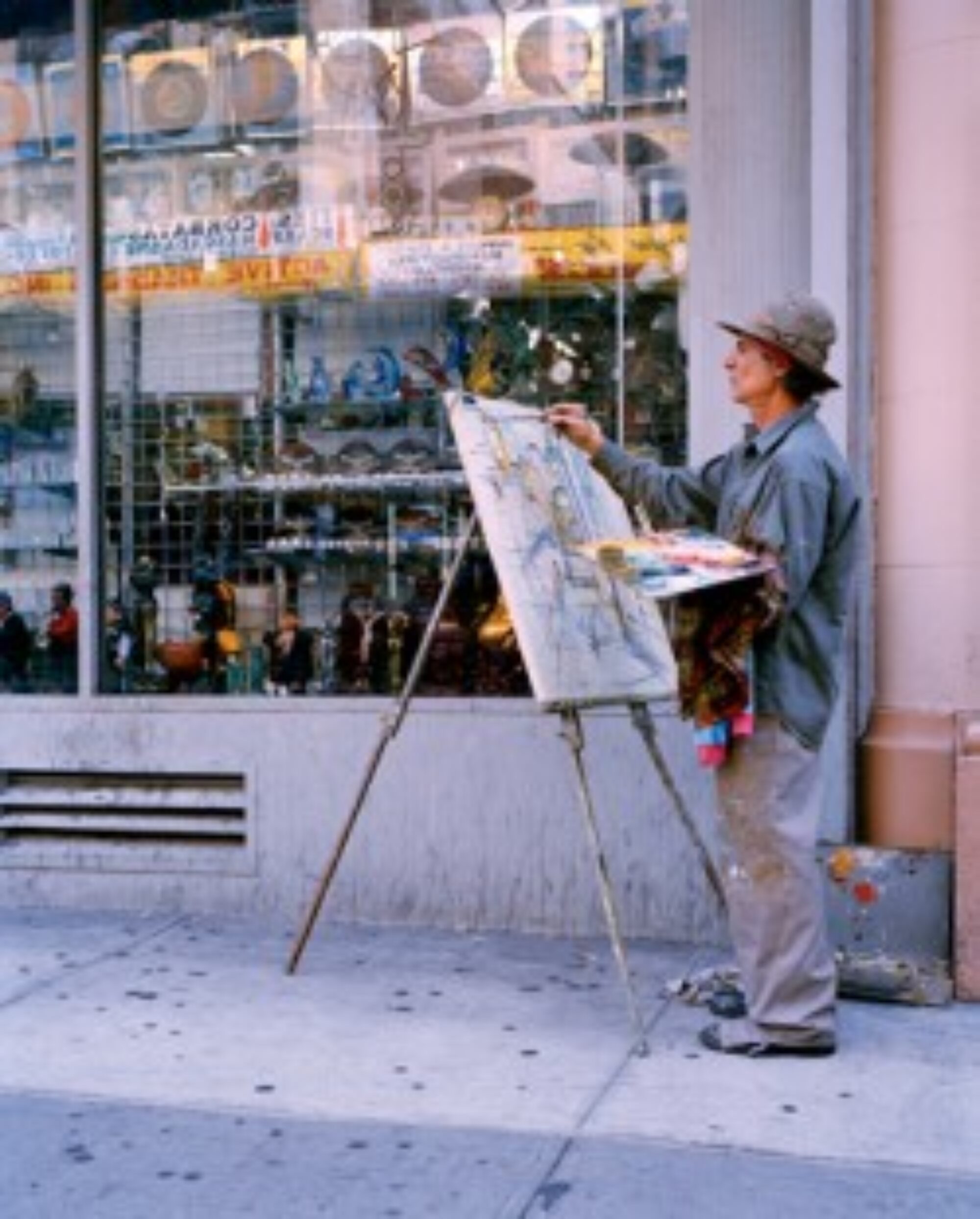 Les peintres de « Plain Air », contactés et photographiés par Jon Naiman dans le lieu précis de leur activité, au moment de cette activité, sortent dans la ville, s’installent en public, mais ne font pas seulement leur travail ; ils sont aussi un spectacle, une performance où ils endossent le rôle de l’« artiste ». La série de Naiman met en évidence cette simultanéité de faire et d’être, d’agir et de représenter.