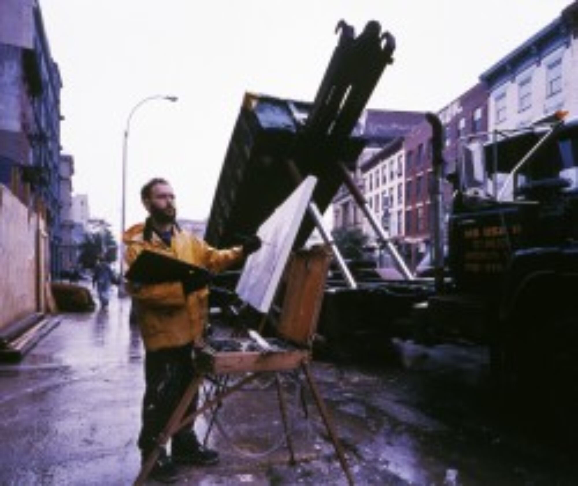 Les lieux stéréotypés de la peinture en plein air, de la peinture de paysage du XIXe siècle, associés à la nature en général, ne se retrouvent pas ici. Dans la série « Plain Air », les peintres se placent dans des lieux urbains, sont au travail face à des chantiers, dans des arrières cours, des zones de commerce ou de transit. Si ces lieux «plain» ne sont pas habituels traditionnellement, la présence du peintre l’est d’autant moins, c’est plutôt un photographe que l’on s’attendrait à voir en milieu urbain : une technique moderne dans et pour des lieux contemporains. Naiman choisit précisément de montrer ce décalage : existe-t-il une technique plus anachronique qu’une autre ? Des sujets plus modernes que d’autres ?