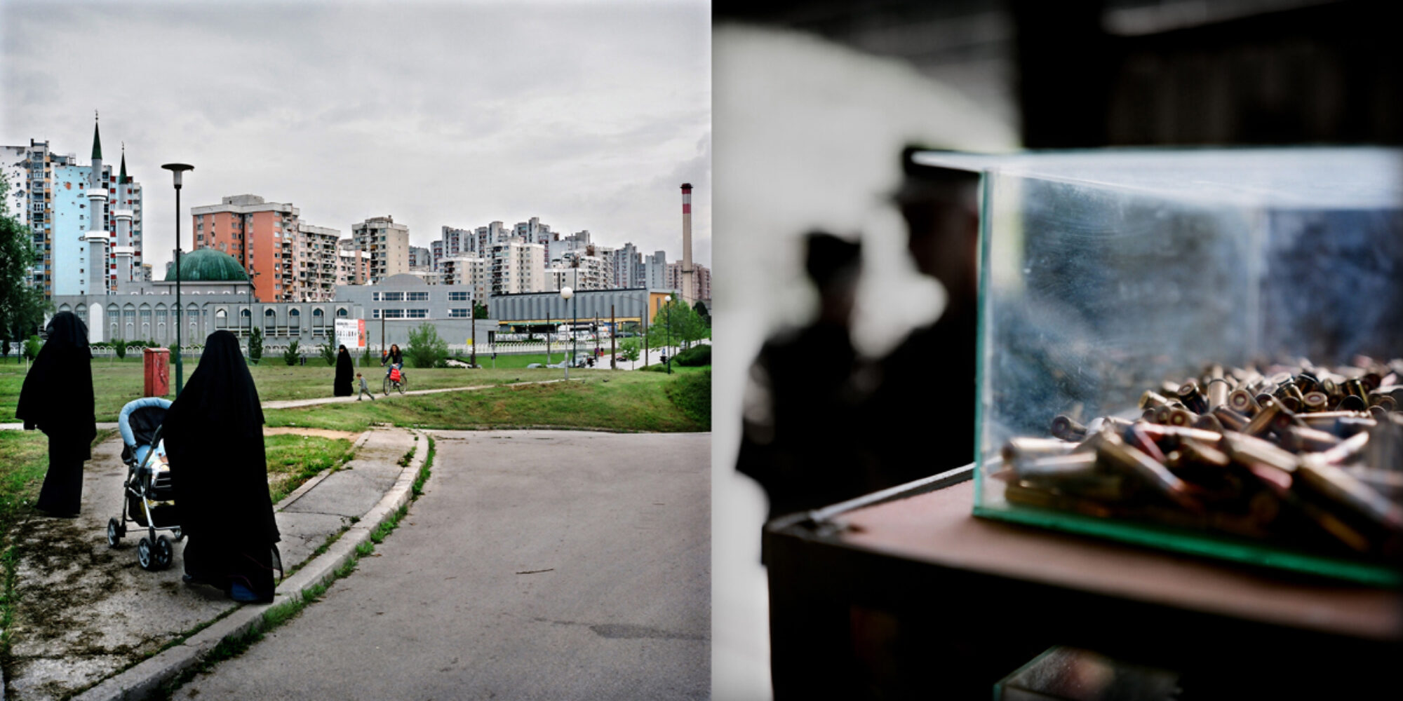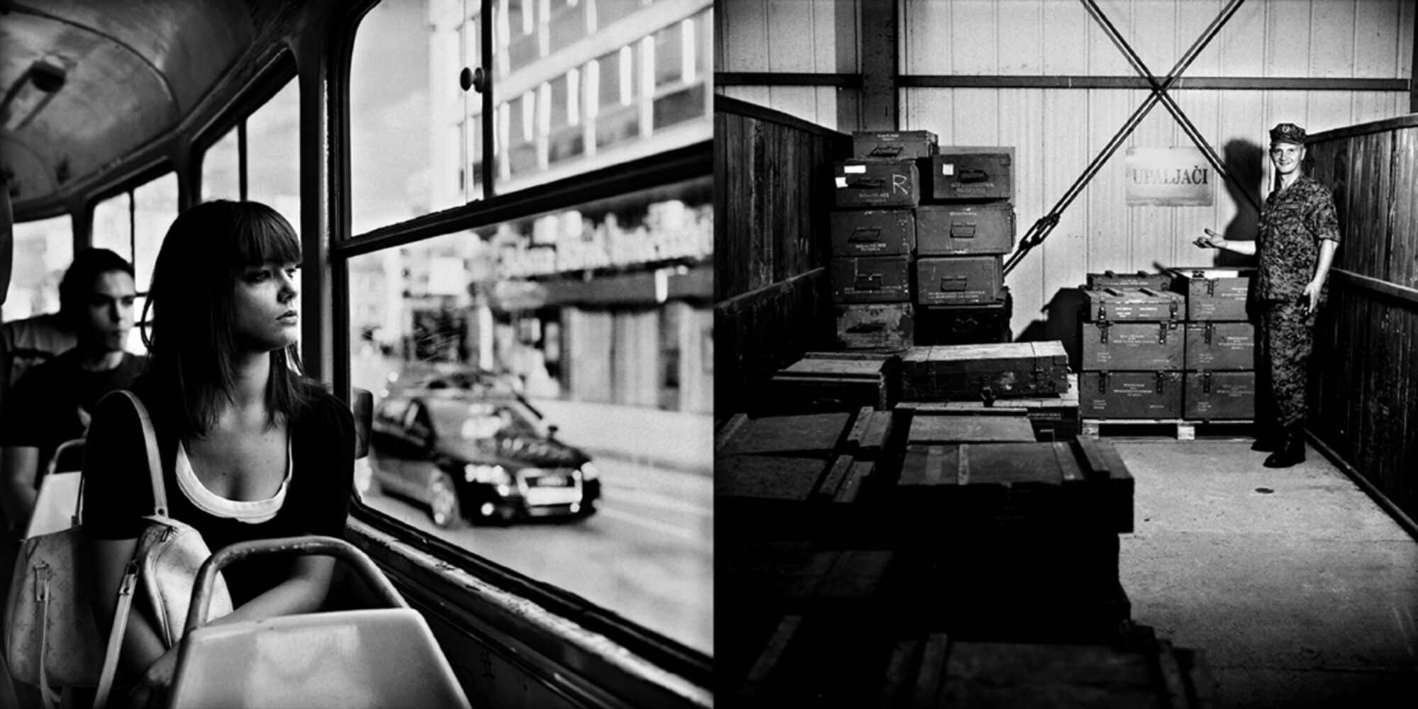 Des entassements d’obus, des caisses empilées contenant de vieilles armes ; des armes en train d’être démontées ; des hommes qui exécutent ce travail. A côté, des personnes dans les transports publics, au café, au bar ; des quartiers de logements. Steeve Iuncker décrit par des diptyques une image de la ville de Sarajevo encore marquée par la guerre, treize ans après la fin du siège des paramilitaires serbes, qui a duré presque quatre ans et pendant lequel plus de 10’000 personnes ont été tuées. Dans le cadre d’un programme par lequel elle soutient financièrement la destruction des anciennes munitions, qui ne proviennent pas seulement du temps de la guerre, l’Union Européenne a chargé Steeve Iuncker de documenter ce désarmement. Eu égard aux traces de la guerre clairement visibles, il aurait semblé hypocrite au photographe de se limiter au sujet demandé sans décrire l’atmosphère et la tension actuellement présentes dans la société.