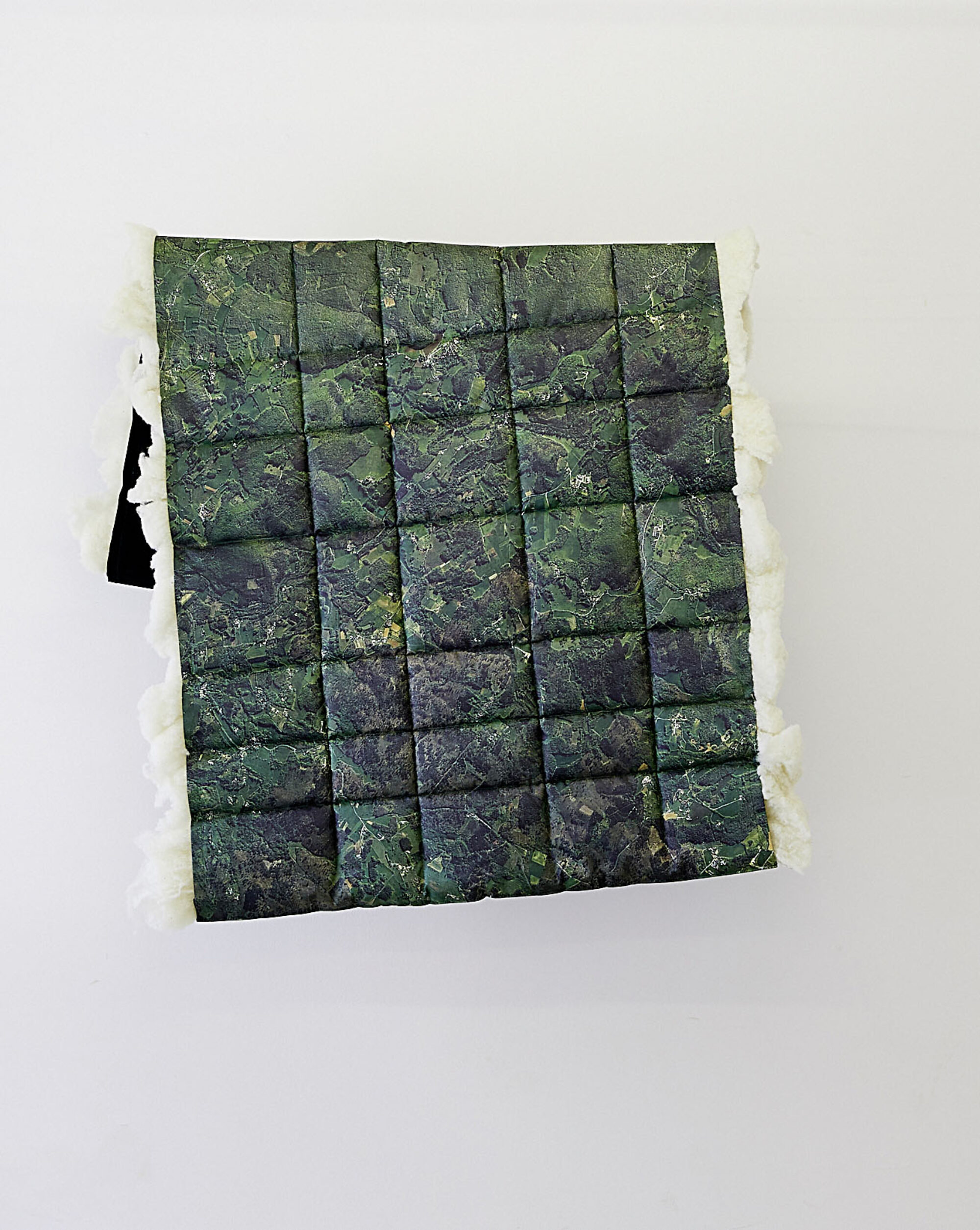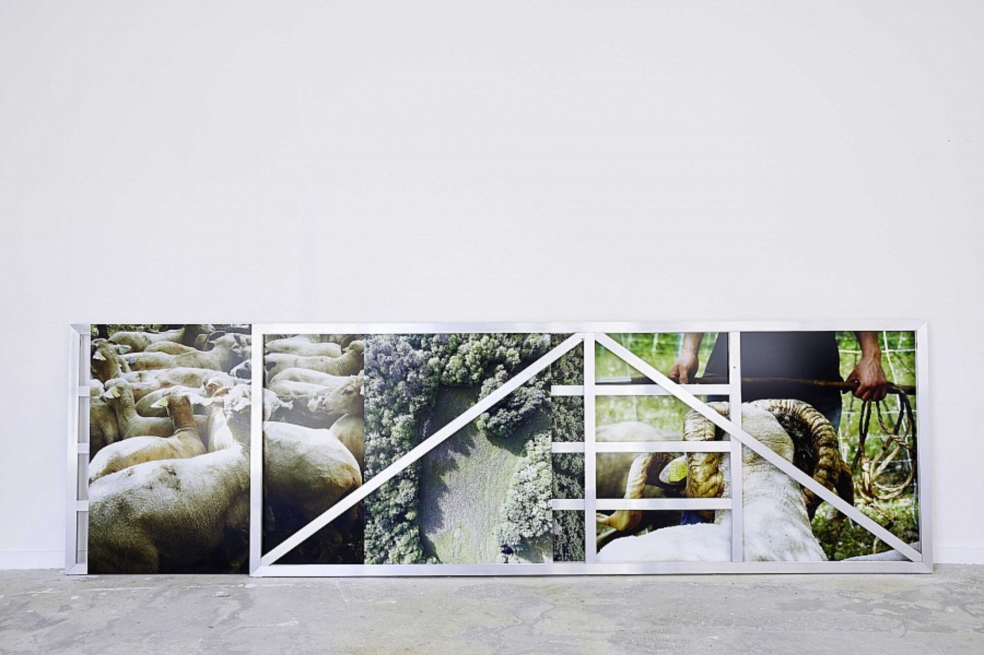 Les installations de Morgane Denzler intègrent l’image photographique dans un ensemble traduisant son expérience de lieux attentivement parcourus et observés pour raconter une histoire. Dans le milieu rural des Arques elle s’est d’abord intéressée au cadastre. D’un arbre à l’autre, d’une clôture à une haie, elle a représenté le paysage fragmenté en parcelles par l’humain, et mis en évidence les propriétés rendues visibles par des clôtures et des barrières. Elle a ensuite donné corps à la relation existant entre l’éleveur de brebis, le troupeau et le paysage par l’intermédiaire d’une peau de mouton imprimée. A travers ses subtils assemblages d’images et de formes, l’artiste questionne la relation d’interdépendance entre le paysage, l’humain et l’animal, mais aussi le désir de l’humain de vouloir maîtriser à tout prix la nature.