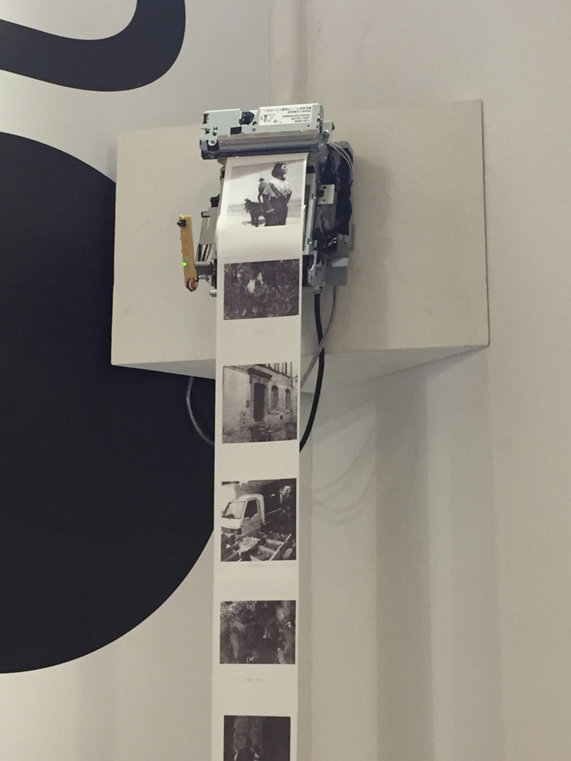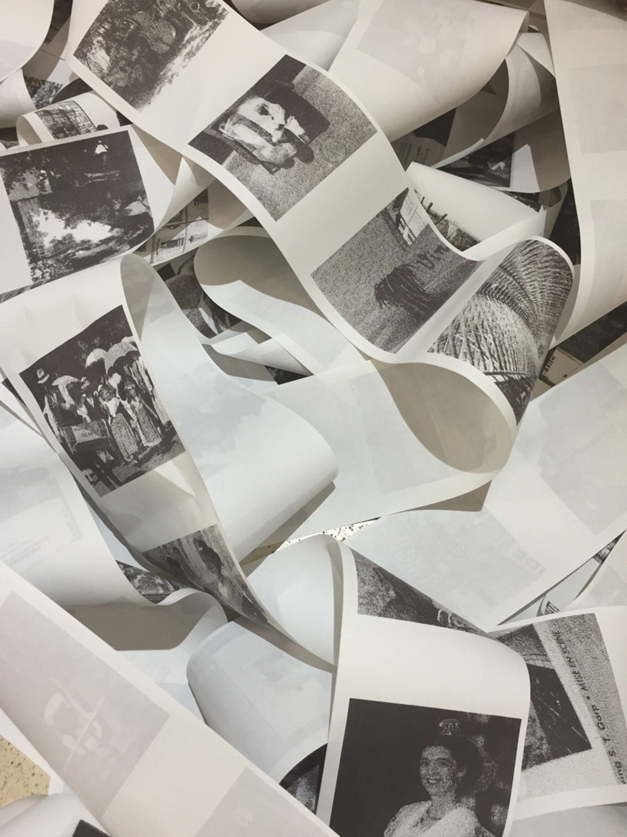 L’installation de Romain Roucoules nous plonge d’emblée dans la thématique «Flood». Aujourd’hui, les expositions génèrent elles aussi, de manière indirecte, une certaine quantité d’images «collatérales» diffusées sur les réseaux sociaux par les spectateur-trice-s et divers-e-s intervenant-e-s proches ou lointain-e-s. Ces images immatérielles sont vouées à faire partie d’un flux et n’existent pas en dehors des conditions imposées par le réseau social sur lequel elles sont postées. En utilisant un dispositif d’impression adapté à la nature inconsistante de ces images, Romain Roucoules tente de transposer ce flux immatériel en flux physique tangible. Au fil du temps, la masse de matière persistante augmente et devient une sculpture évolutive qui témoigne des usages des réseaux sociaux.